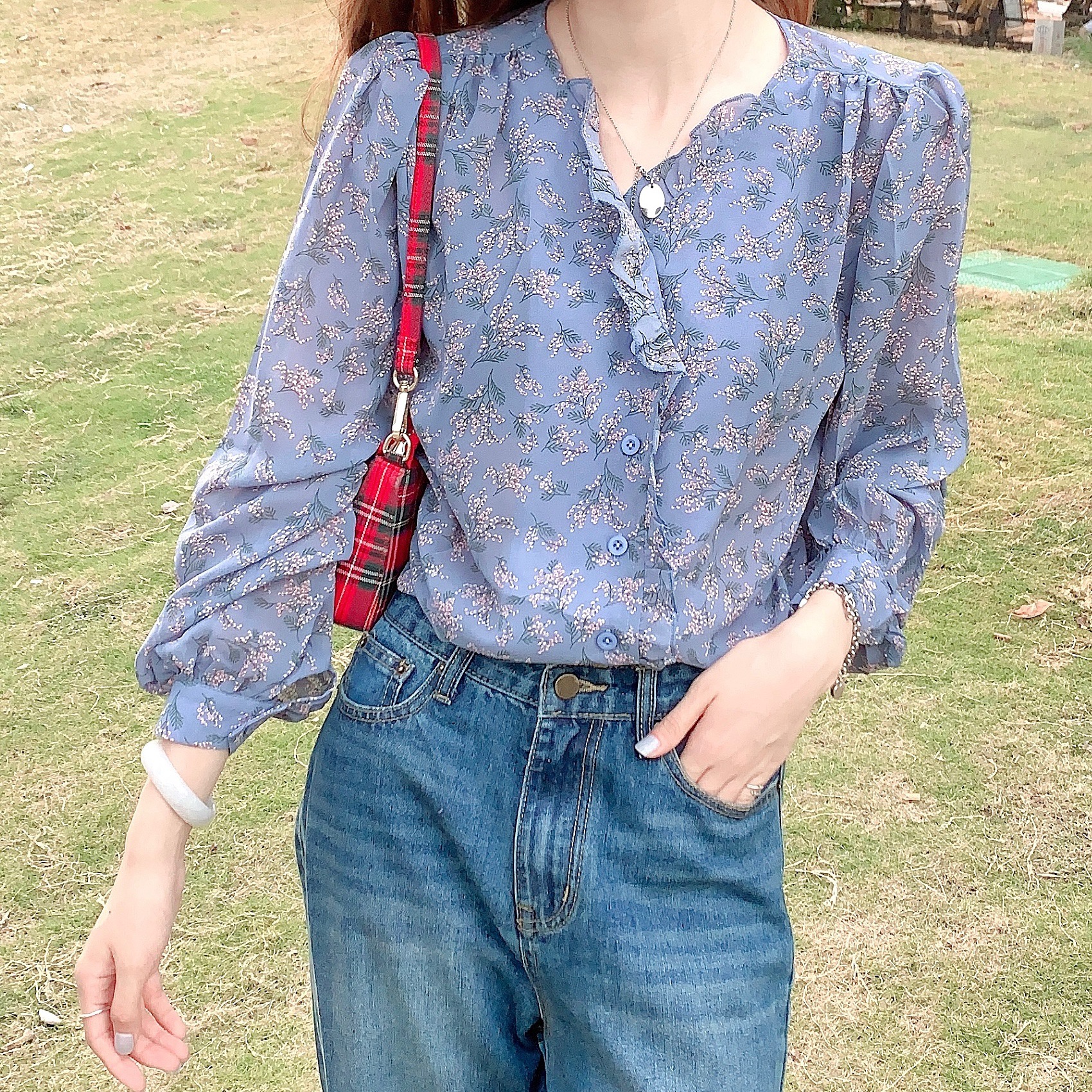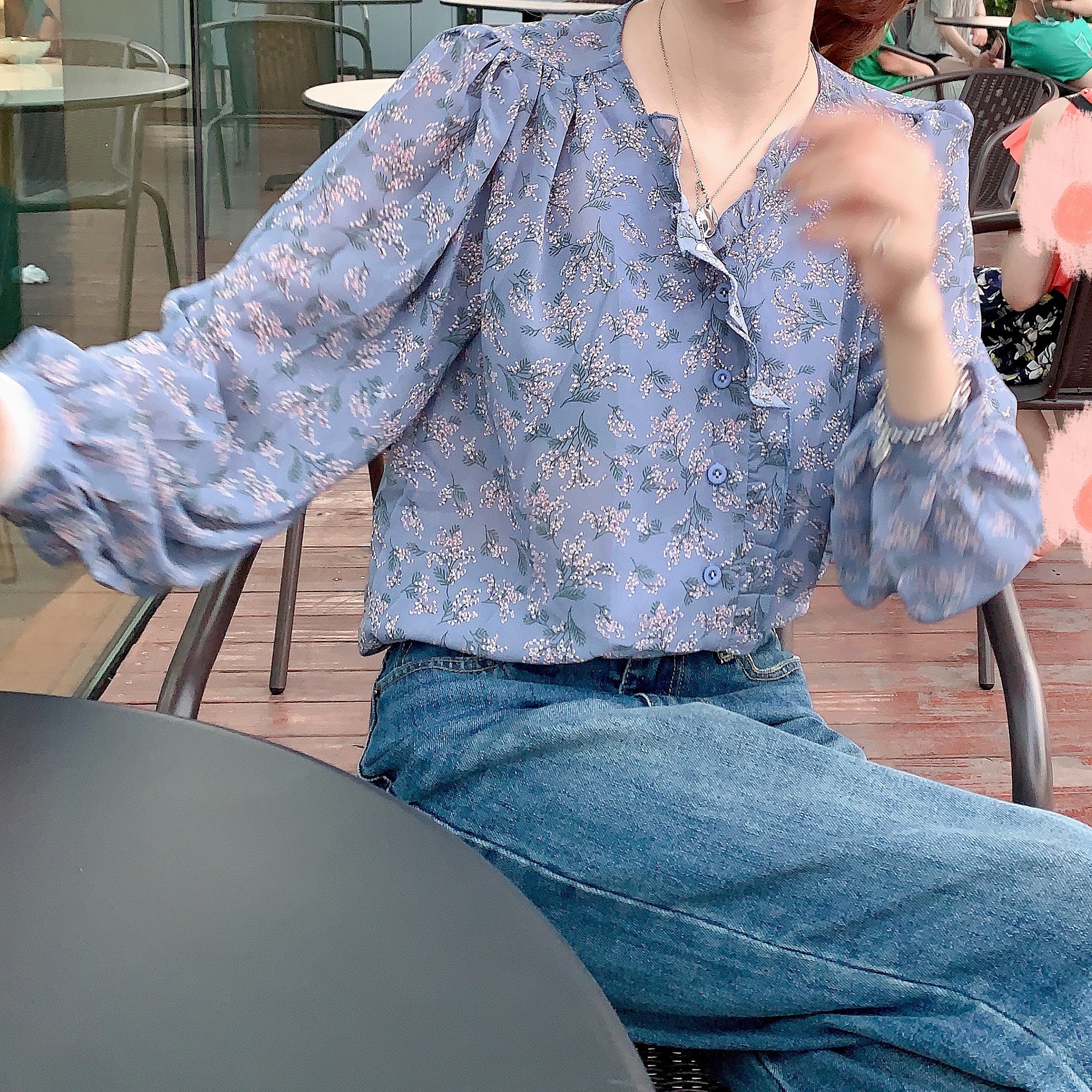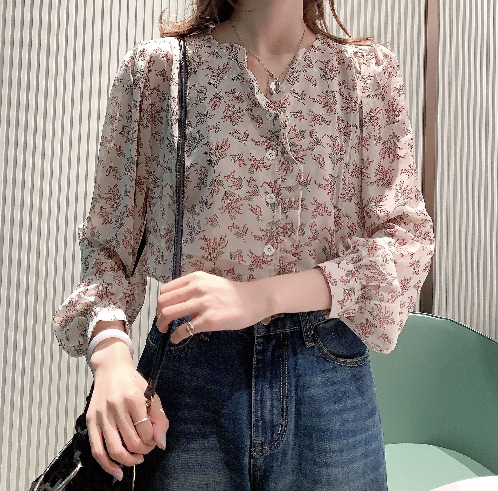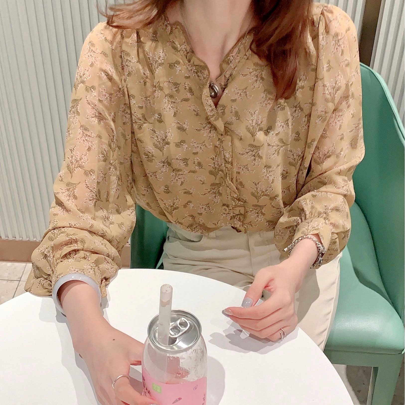 2 023 new 작은 셔츠 외국 스타일 부드러운 바람 꽃 쉬폰 셔츠 여성의 긴 소매 바닥 셔츠 버블 슬리브 셔츠의 한국판스토어 가기