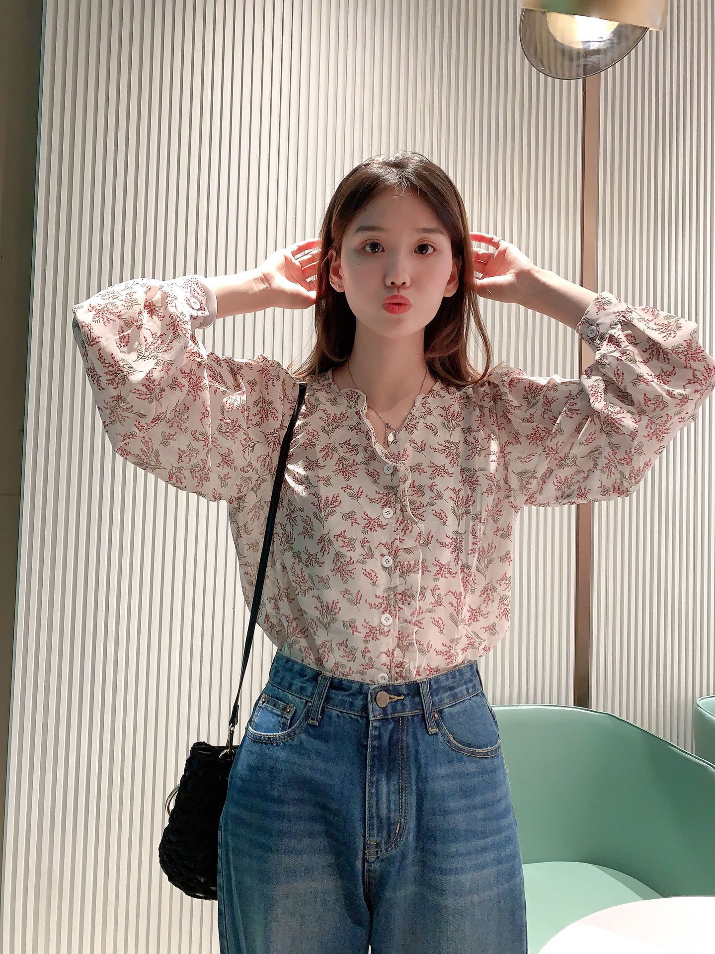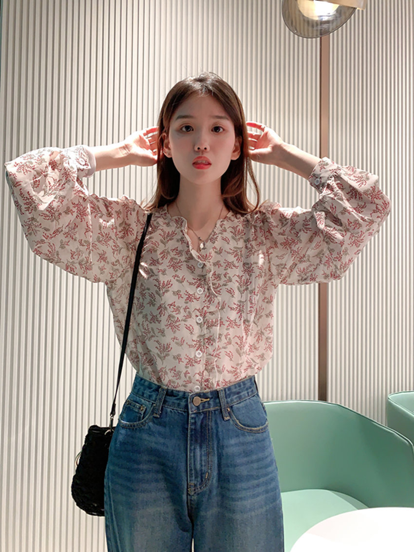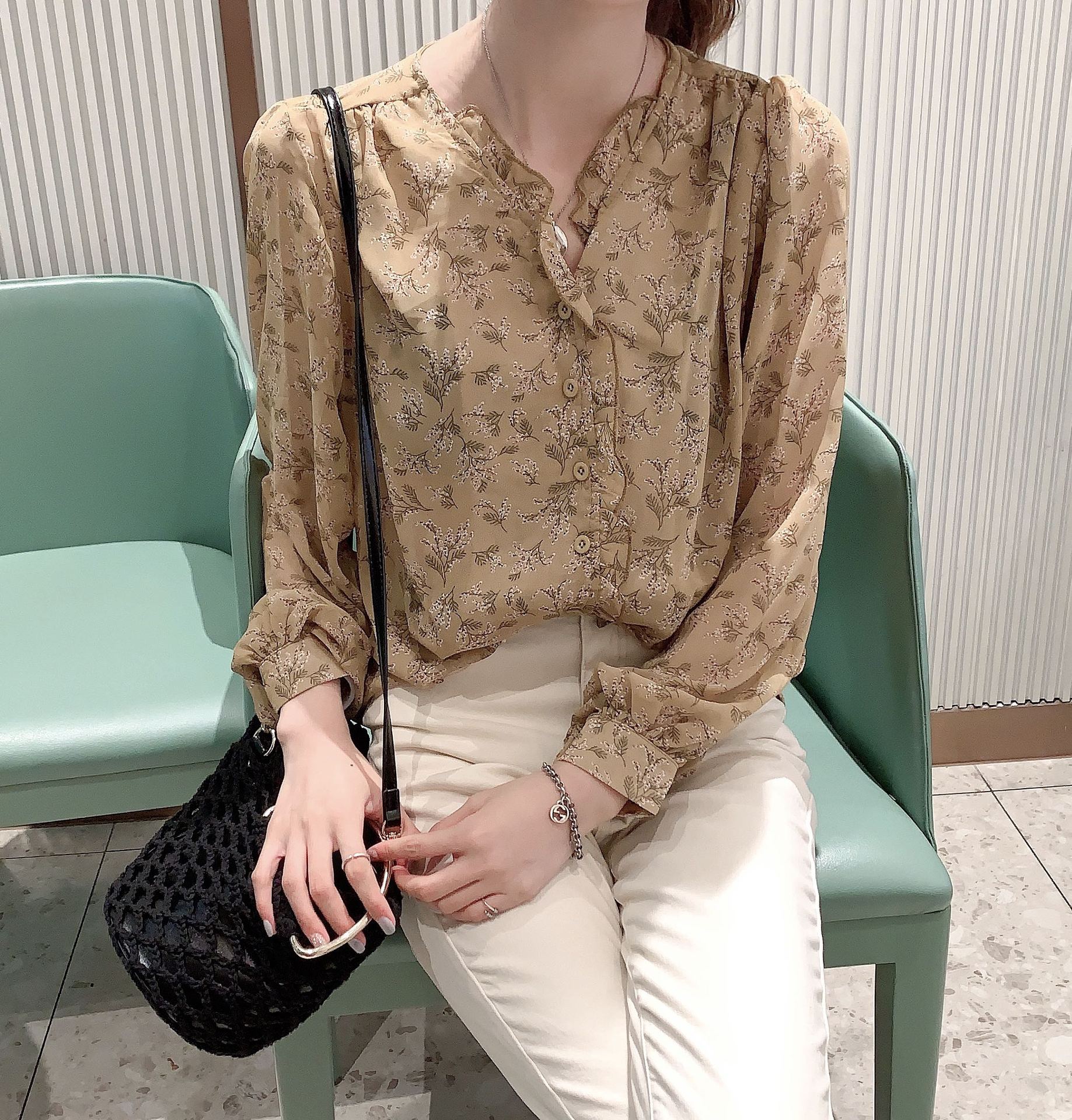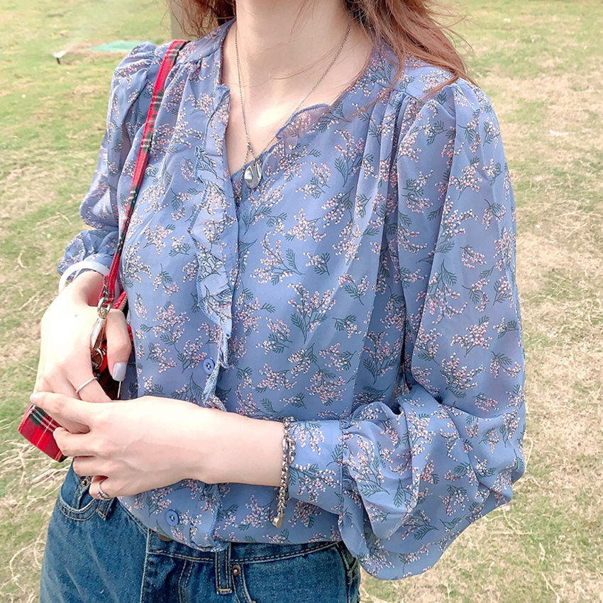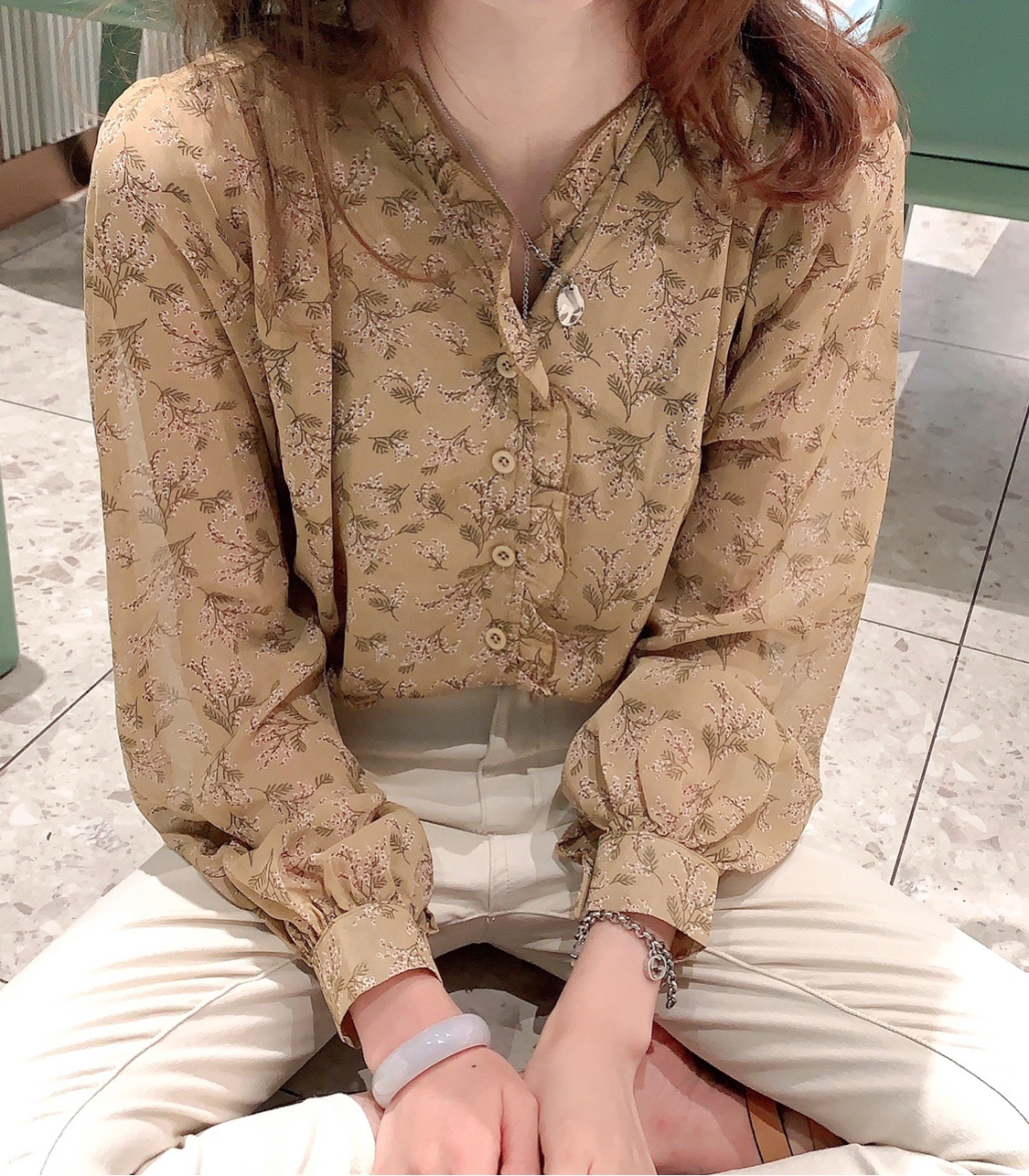 2 023 new 작은 셔츠 외국 스타일 부드러운 바람 꽃 쉬폰 셔츠 여성의 긴 소매 바닥 셔츠 버블 슬리브 셔츠의 한국판