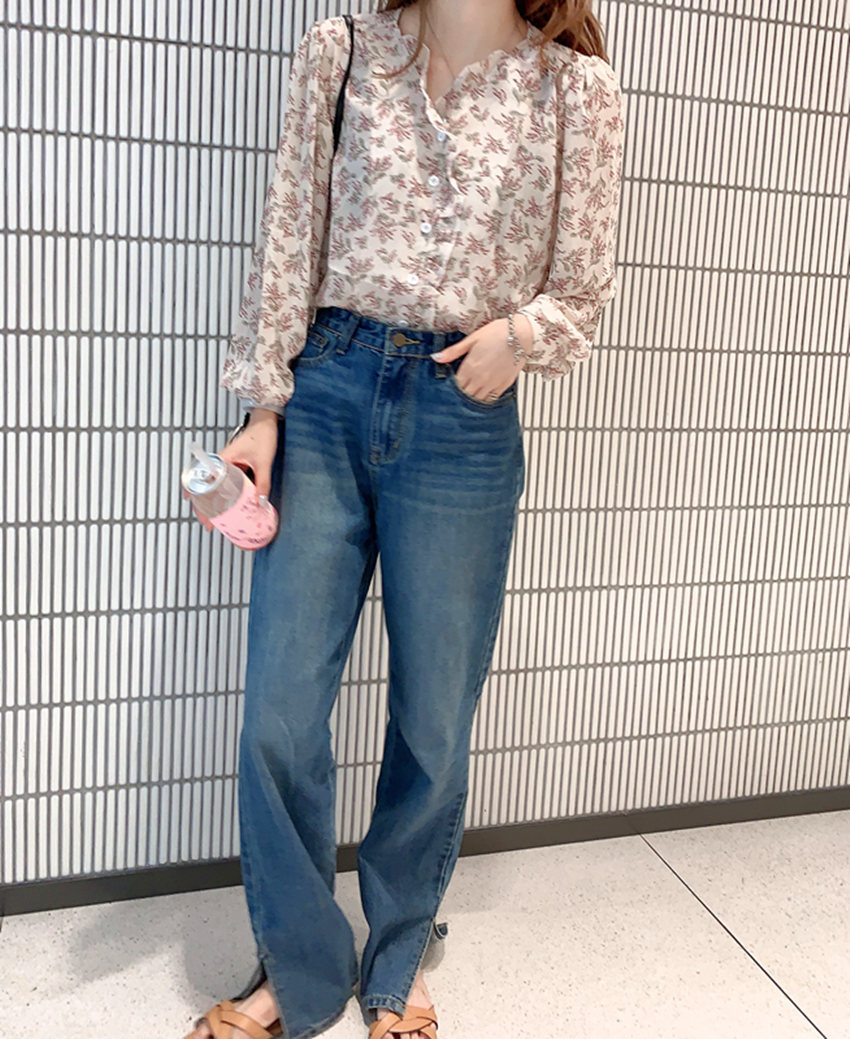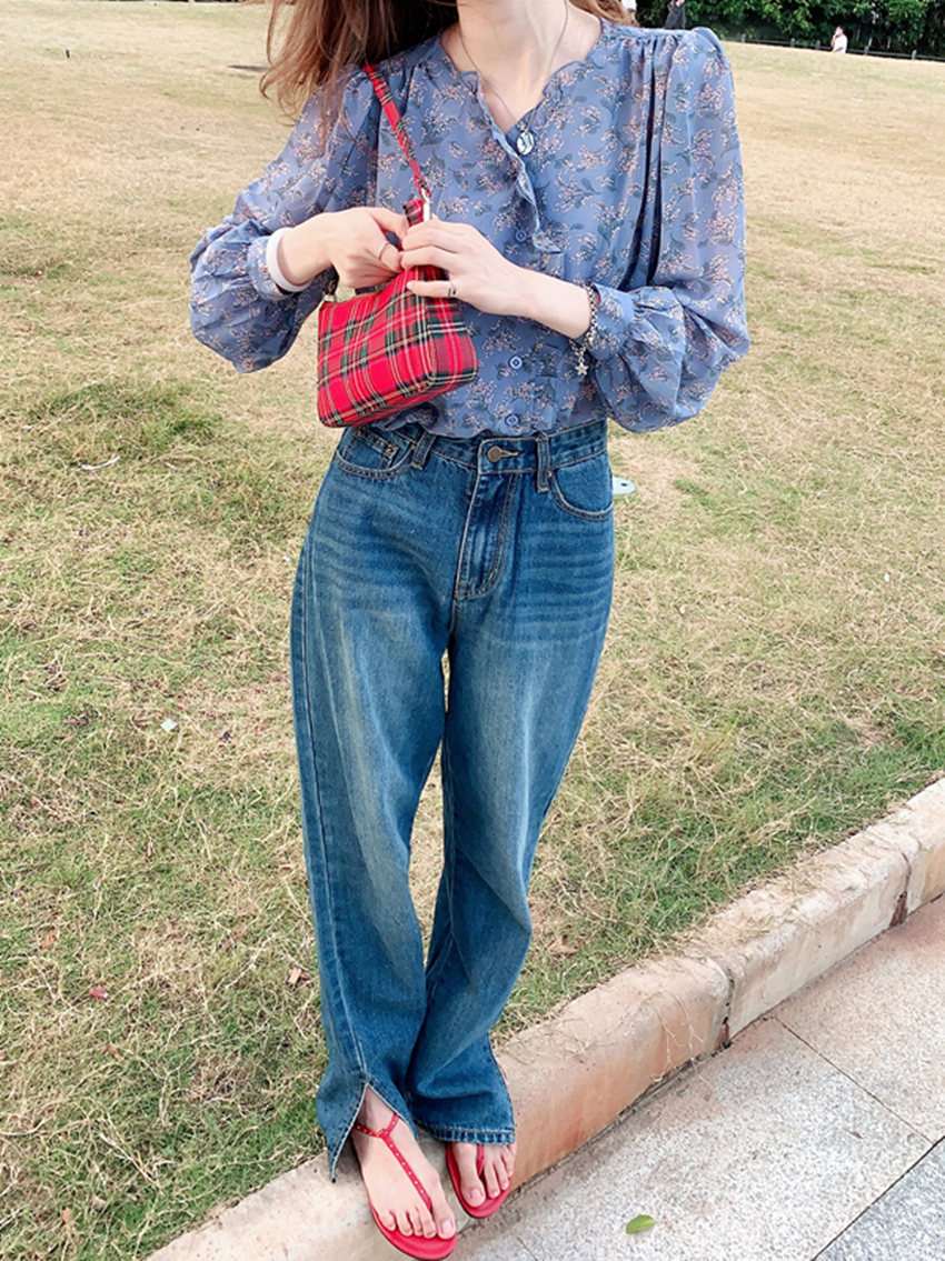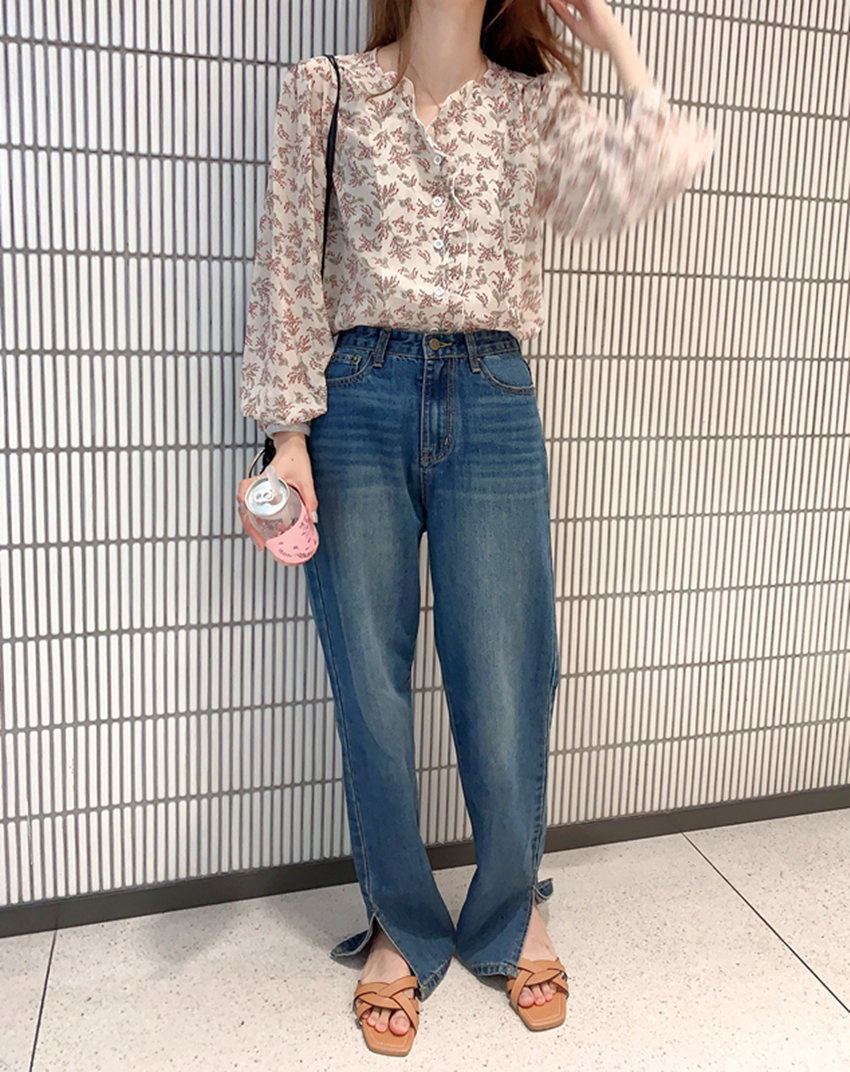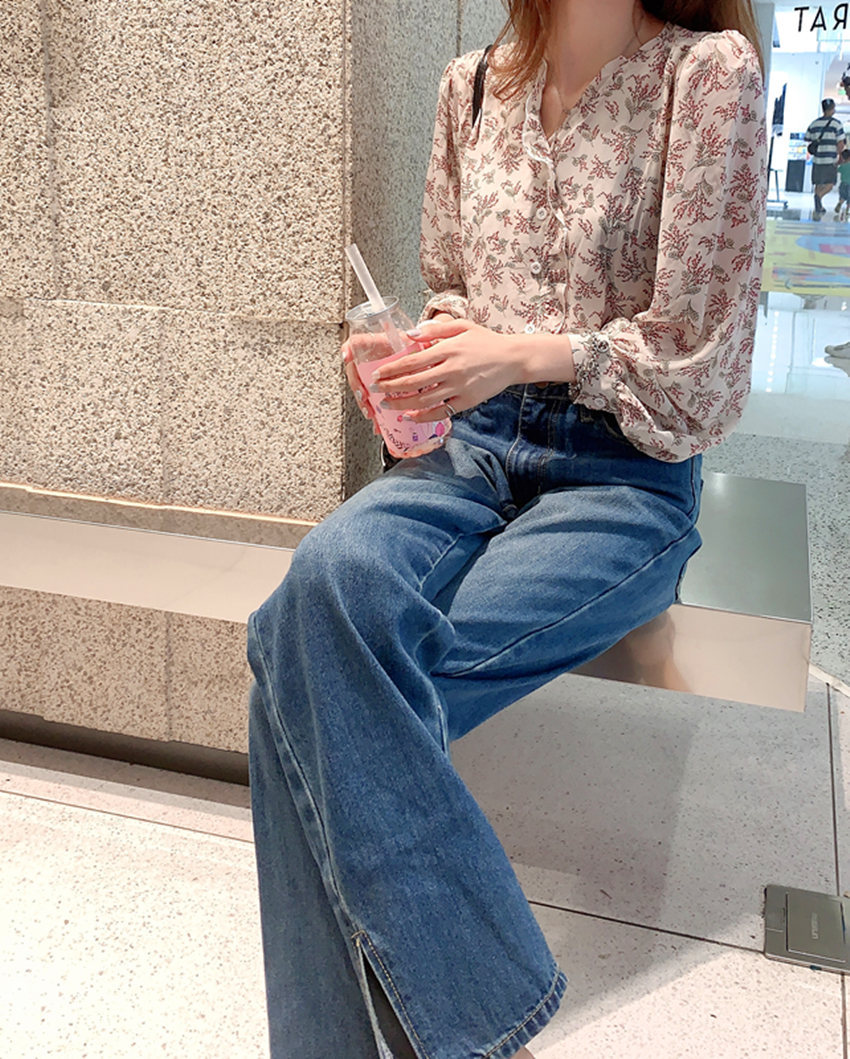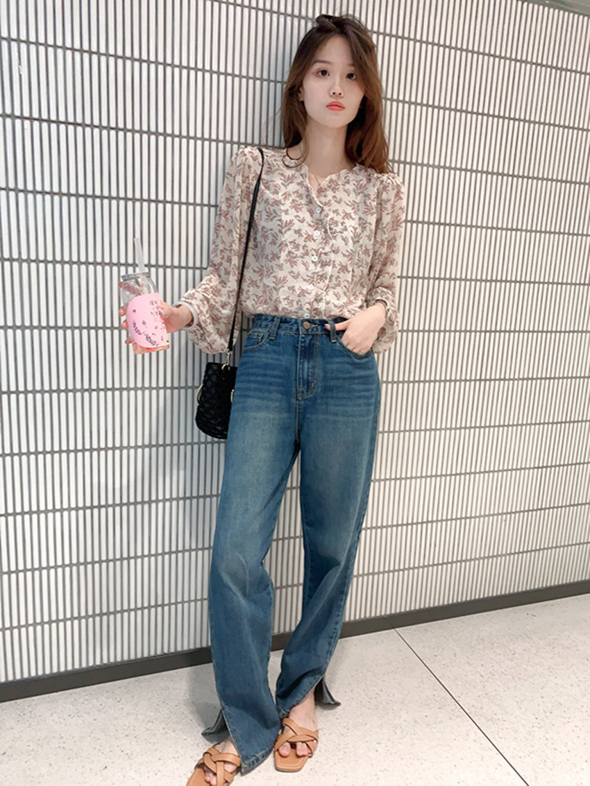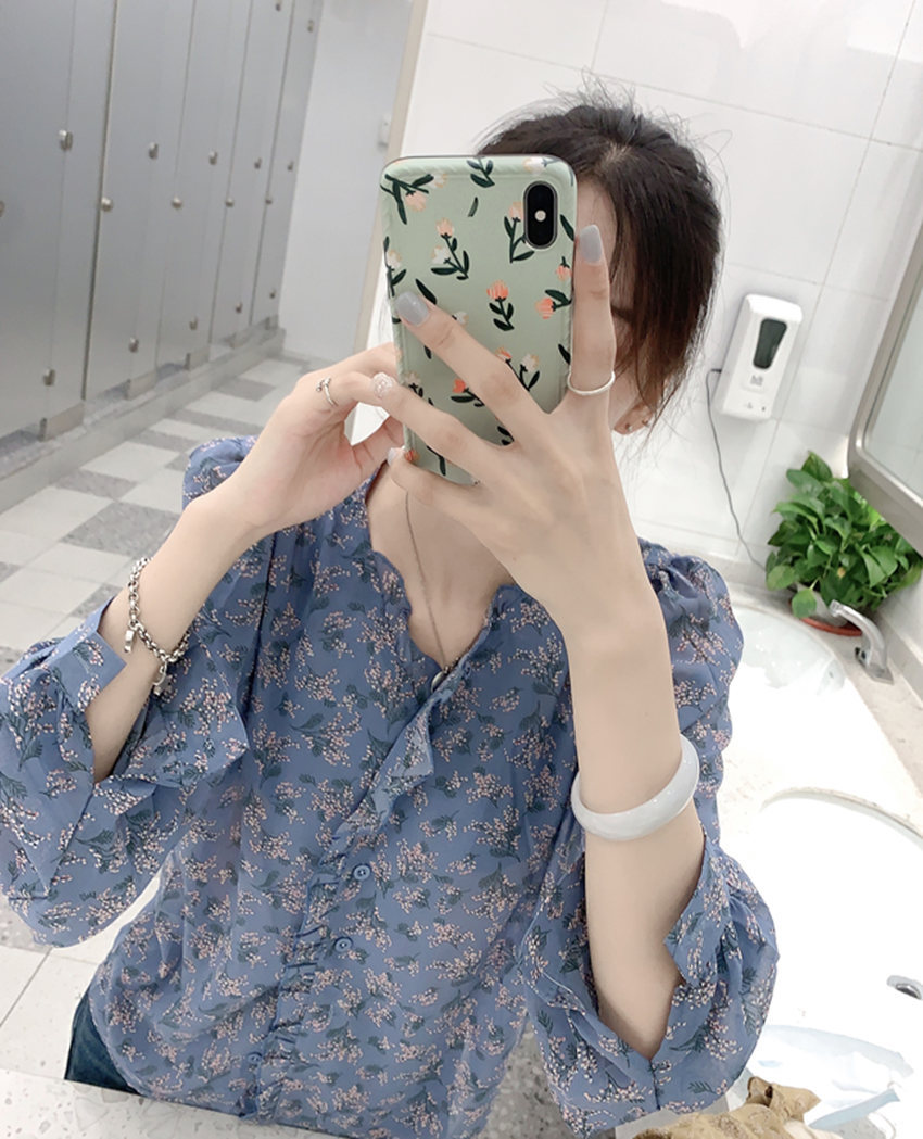 2 023 new 작은 셔츠 외국 스타일 부드러운 바람 꽃 쉬폰 셔츠 여성의 긴 소매 바닥 셔츠 버블 슬리브 셔츠의 한국판