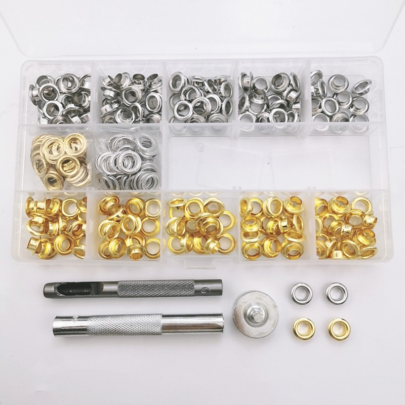 产品内容:一盒所包含的内容为:银白色、金色各100套气眼扣+400#手敲工具一组3件套+收纳盒装
