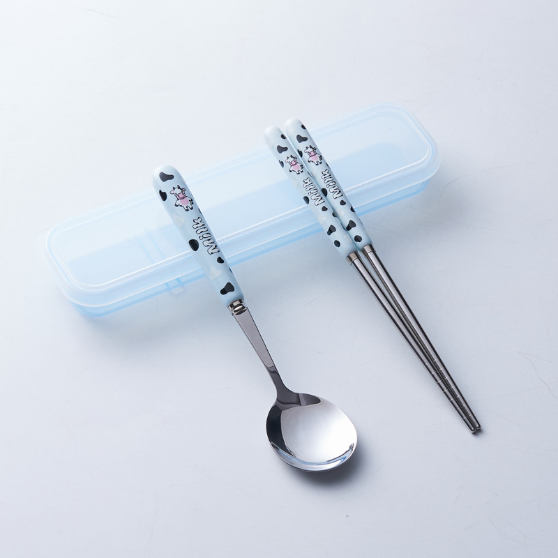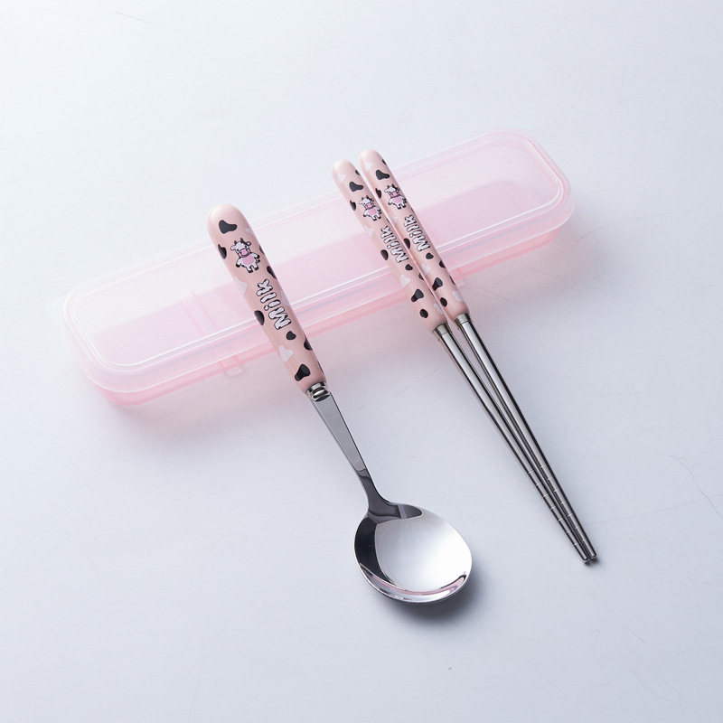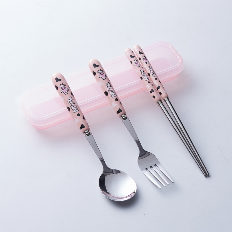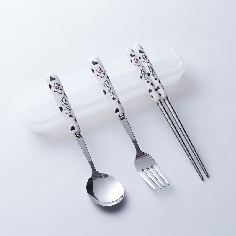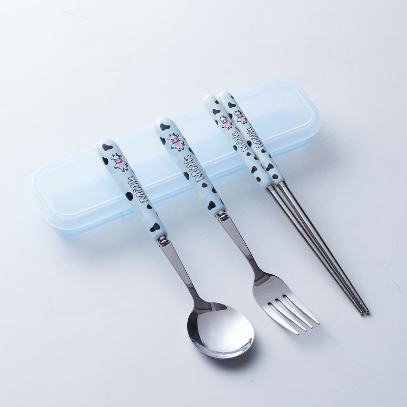 휴대용 수납 식기 3종 세트 귀여운 소 스테인레스 스틸 어린이 식기 포크 세트 스푼 젓가락 세트
