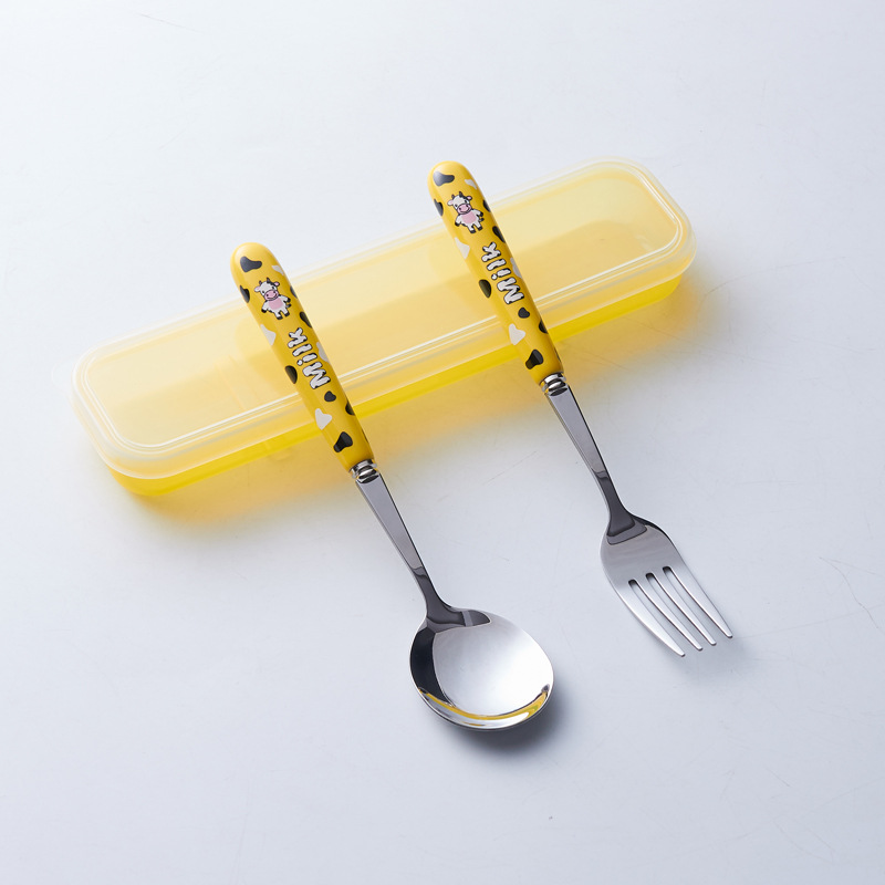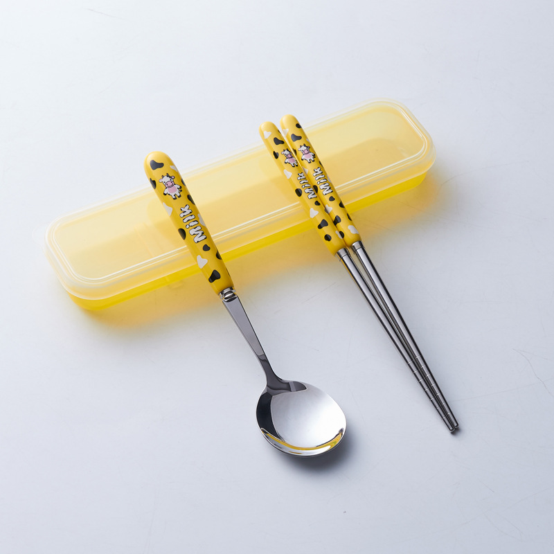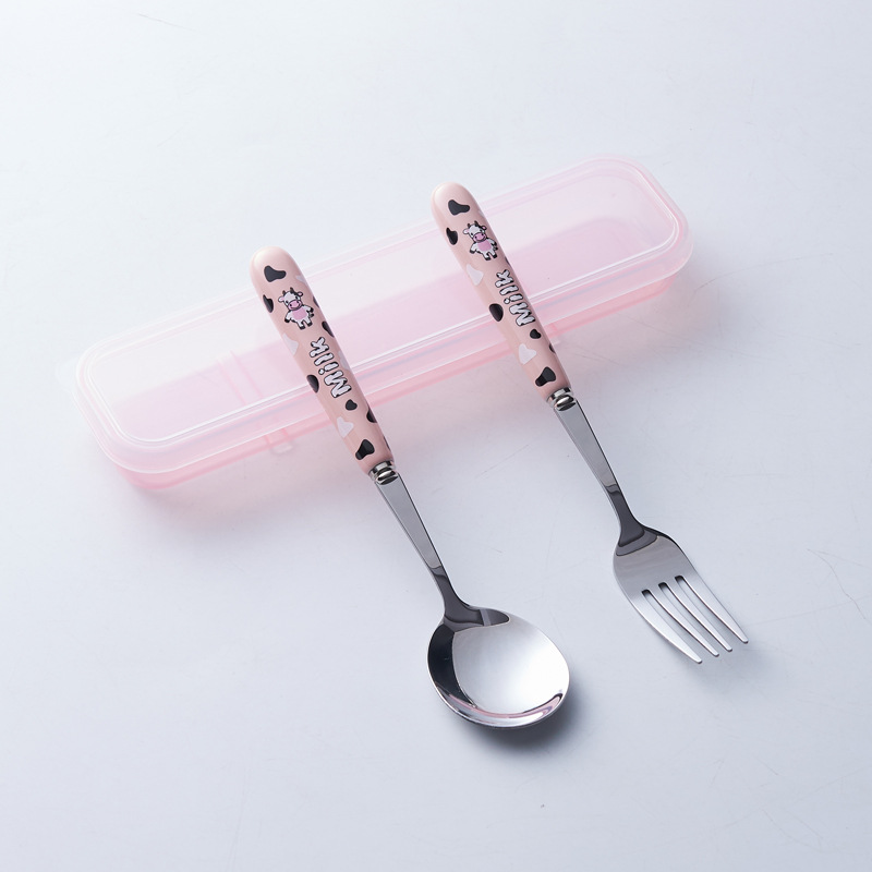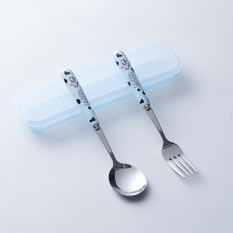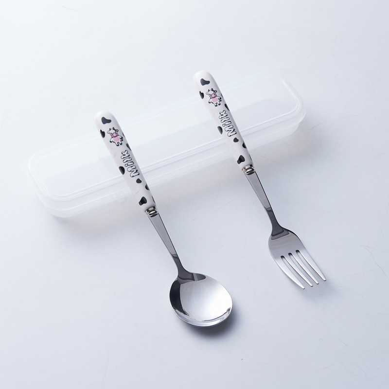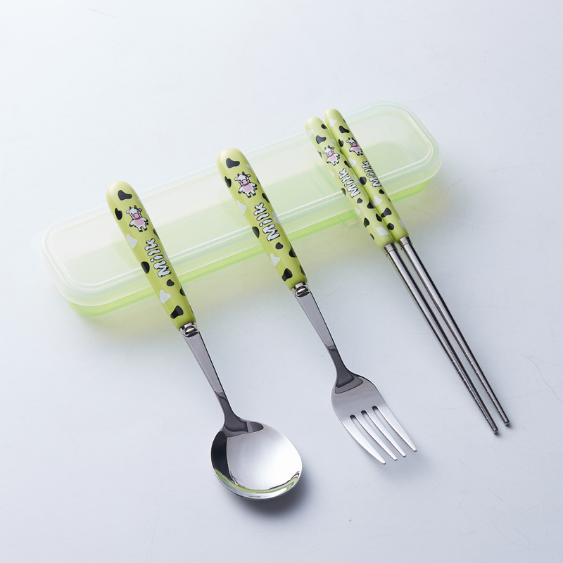 휴대용 수납 식기 3종 세트 귀여운 소 스테인레스 스틸 어린이 식기 포크 세트 스푼 젓가락 세트