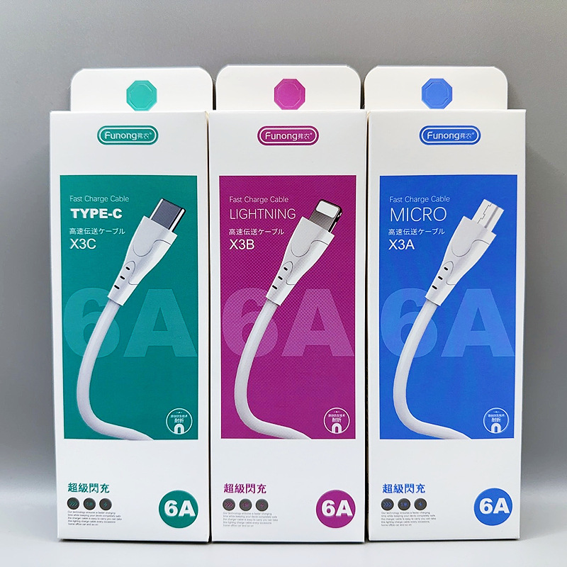6A 완벽하게 호환되는 플래시 충전 데이터 케이블 iPhone Android Type-C 휴대 전화 충전 케이블 도매를위한 초고속 충전스토어 가기