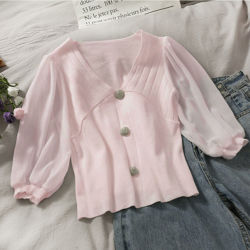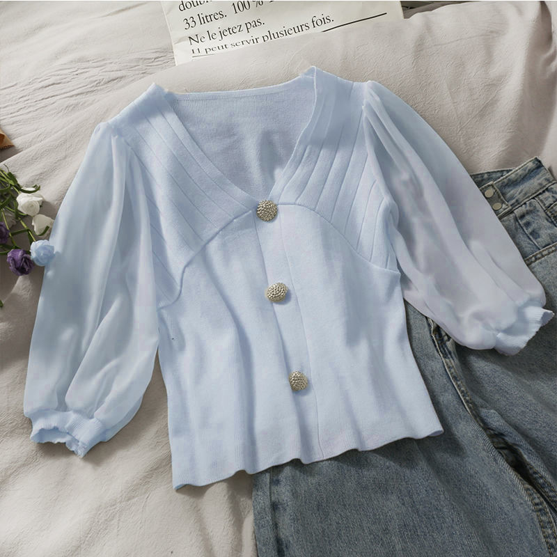 2023 여름 단색 쉬폰 트렌디 브이넥 쓰리버튼 슬림핏 슬림핏 스웨터 여성용 스티칭 퍼프 슬리브 탑스토어 가기