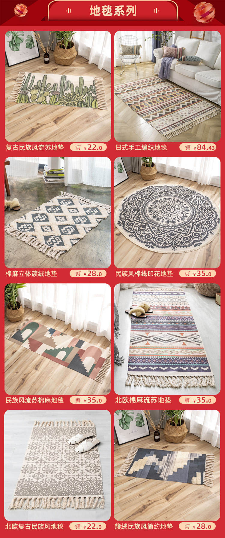 크로스 보더 코튼 짠 두꺼운 미끄럼 방지 술 매트 에스닉 스타일 인쇄 주방 거실 침대 옆 카펫스토어 가기