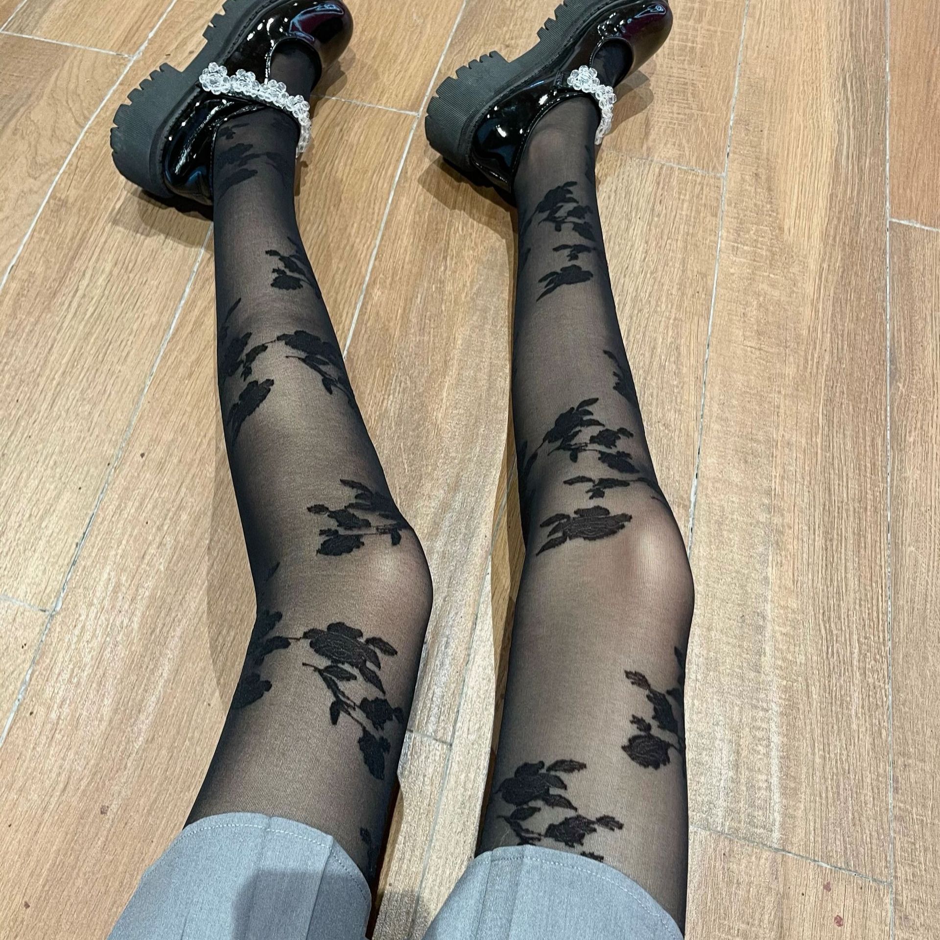 봄과 여름 얇은 빈티지 크림 화이트 스판덱스 로즈 자카드 팬티 스타킹 초박형 살점 다크 스타일 블랙 실크 스타킹