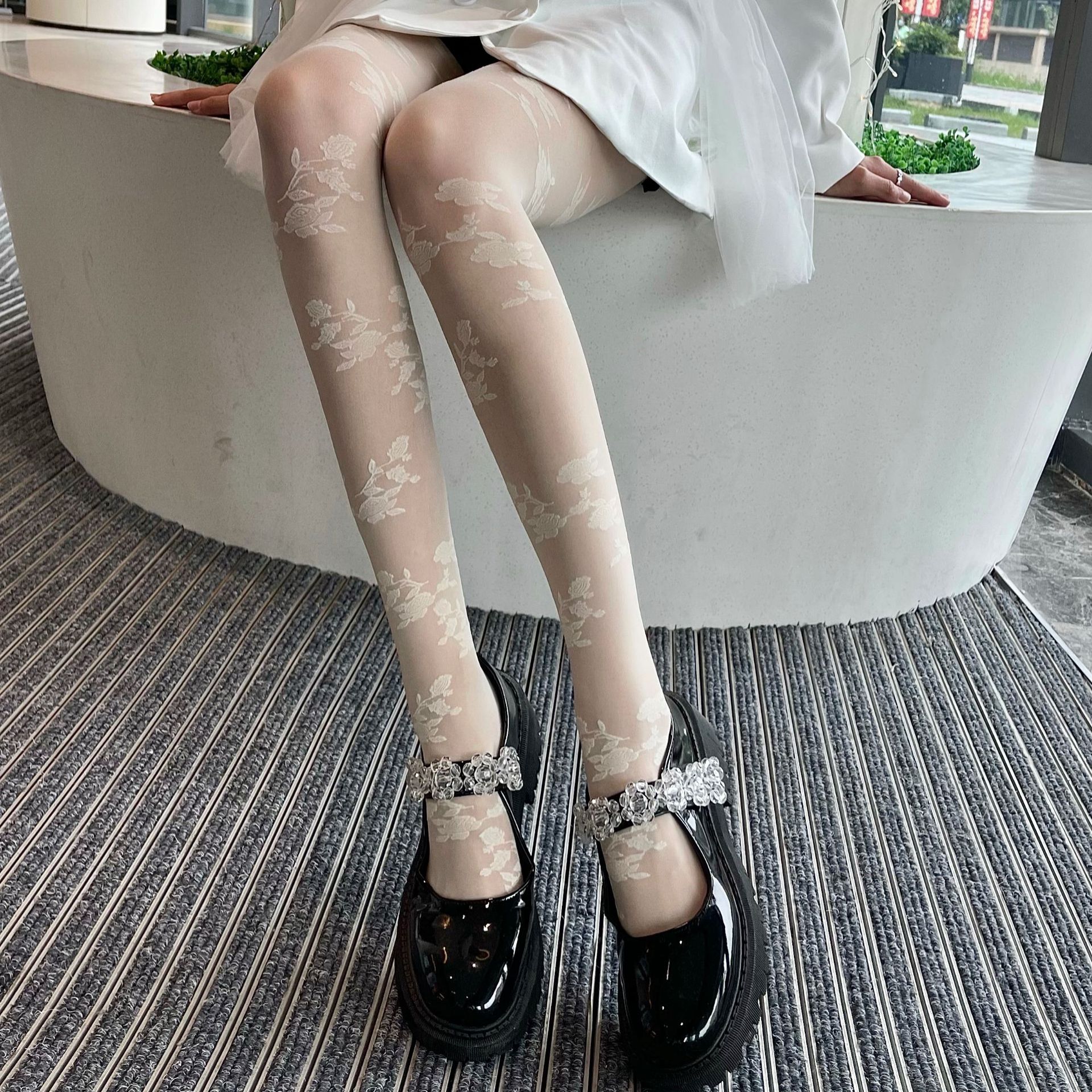 봄과 여름 얇은 빈티지 크림 화이트 스판덱스 로즈 자카드 팬티 스타킹 초박형 살점 다크 스타일 블랙 실크 스타킹스토어 가기