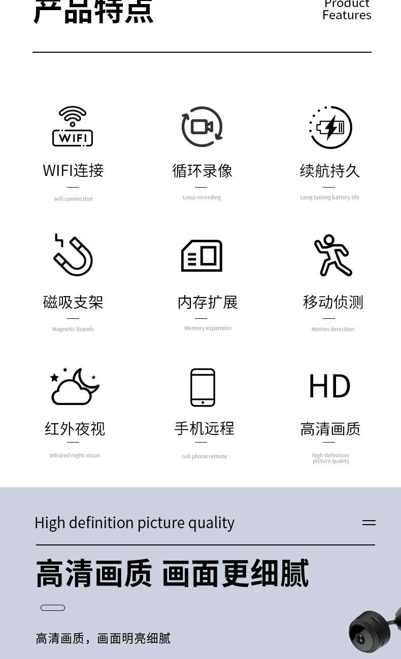 A9 카메라 홈 보안 무선 고화질 스마트 와이파이 원격 카메라 1080p 나이트 비전 액션 카메라