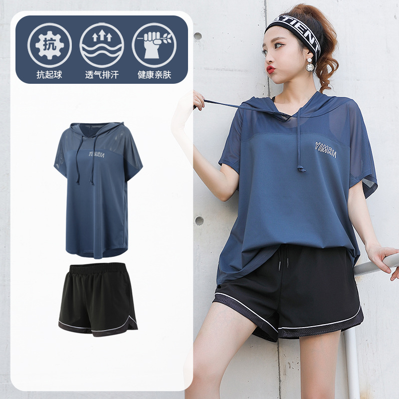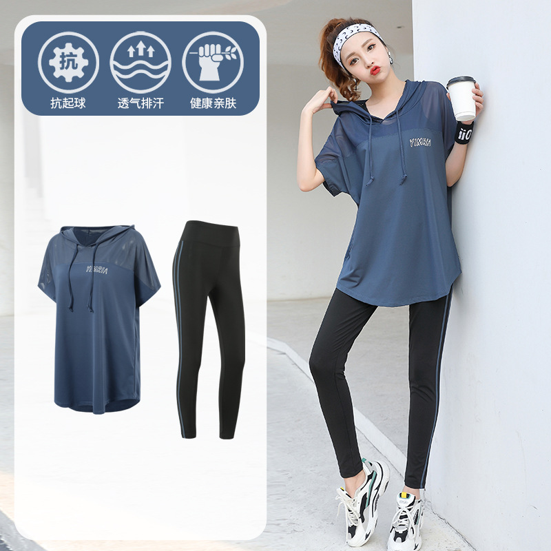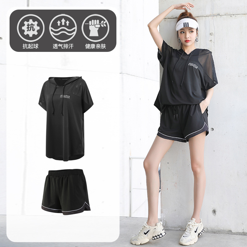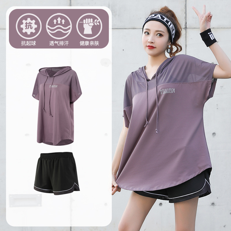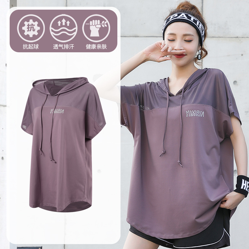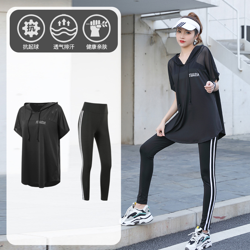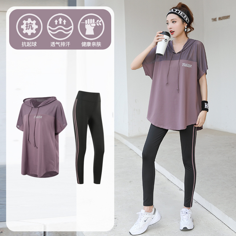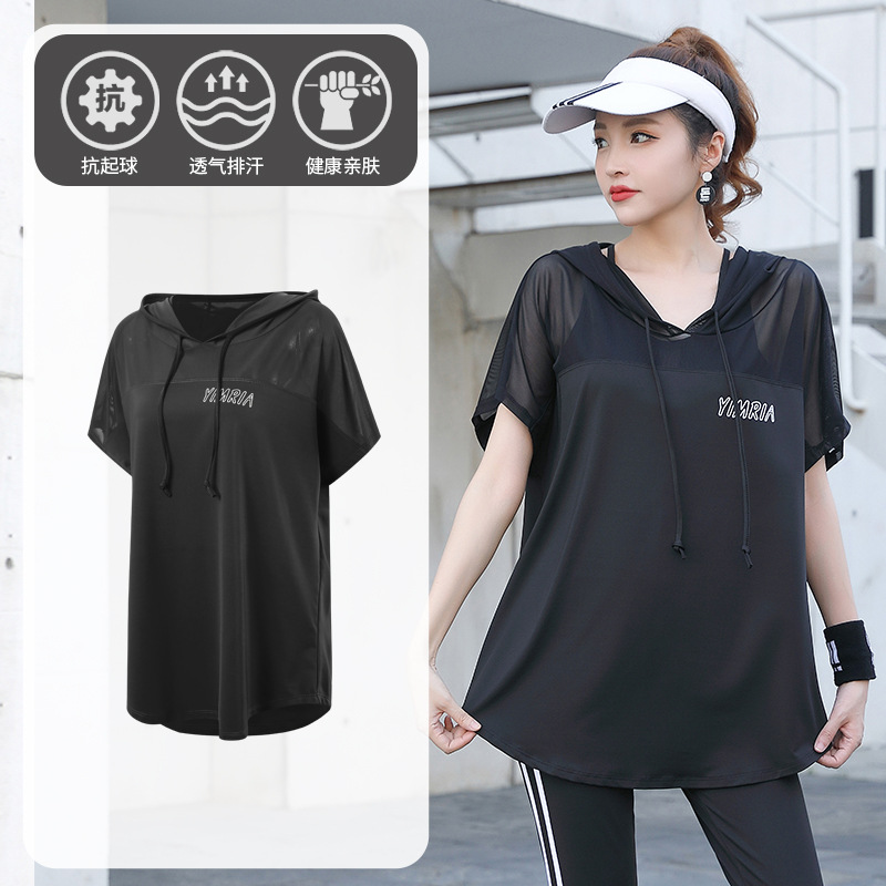 요가 옷 여성의 플러스 사이즈 느슨한 메쉬 태양 보호 후드 빠른 건조 옷 세트 아침 달리기 스포츠 여름 달리기스토어 가기