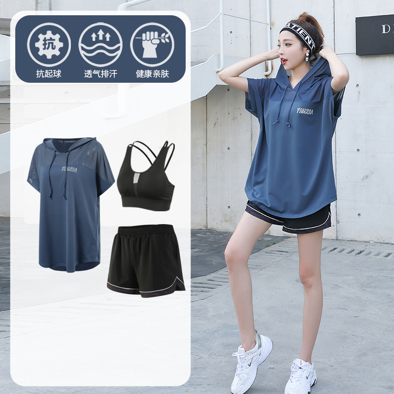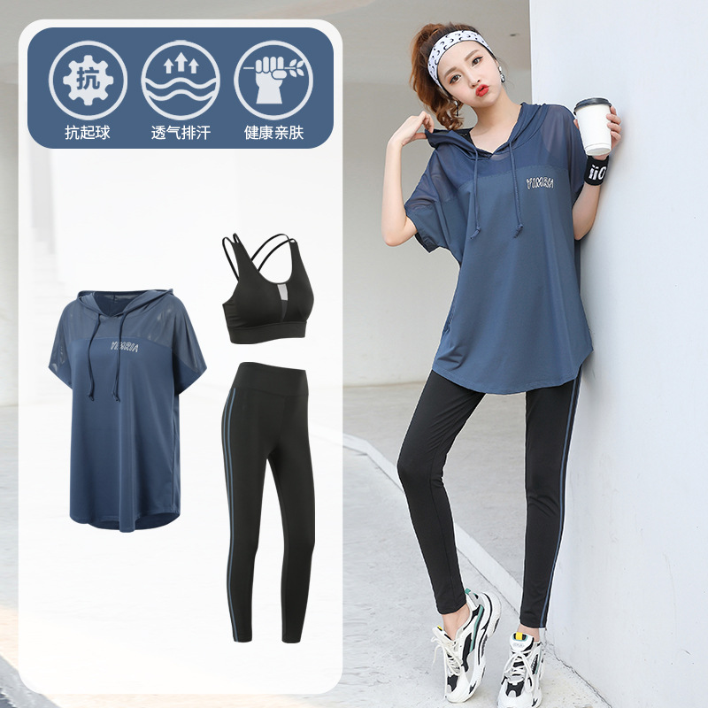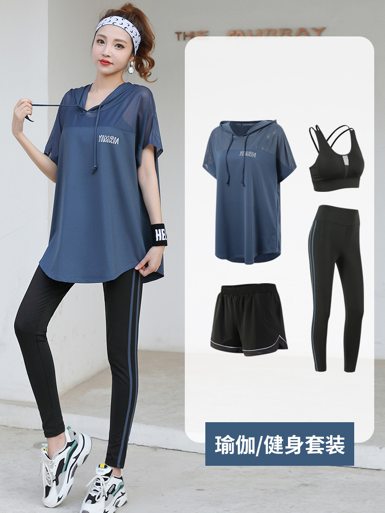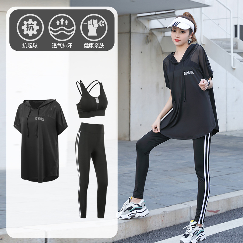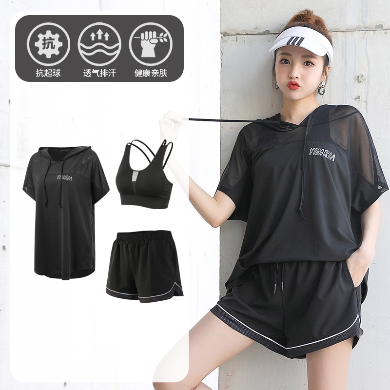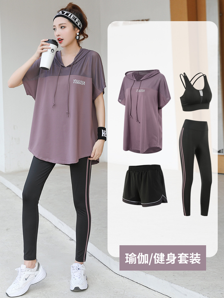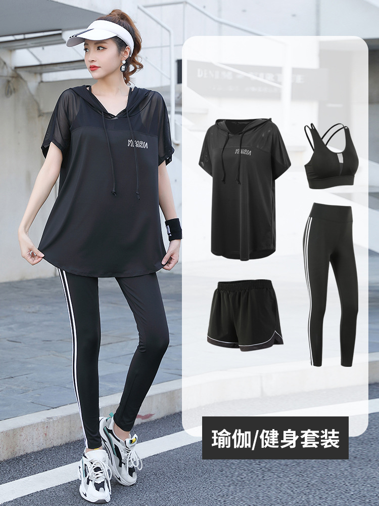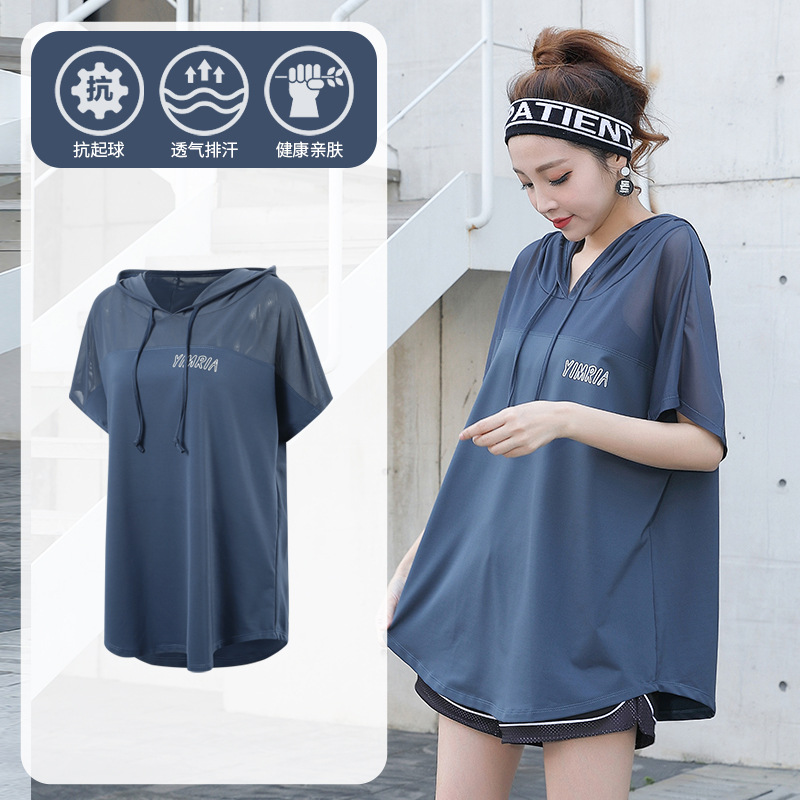 요가 옷 여성의 플러스 사이즈 느슨한 메쉬 태양 보호 후드 빠른 건조 옷 세트 아침 달리기 스포츠 여름 달리기스토어 가기