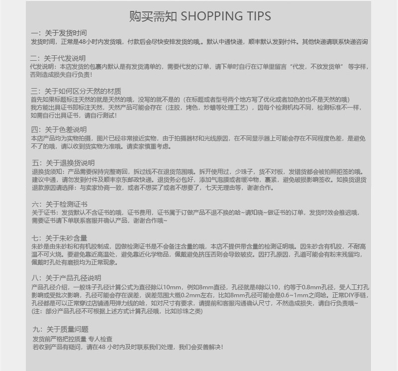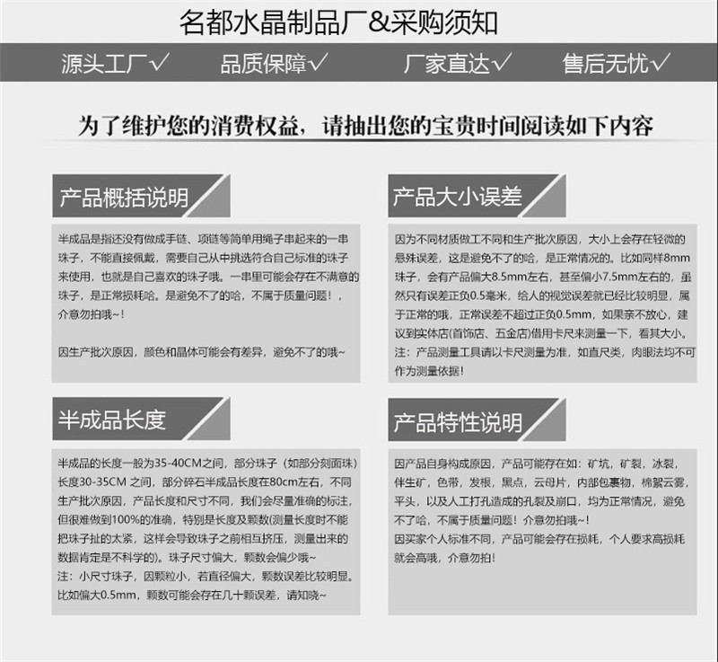产品会具有棉絮,冰裂,矿缺,黑点杂志等和打磨过程中人为造成的硬伤,还有的手链单珠会有微小的大小悬殊,请大家了解