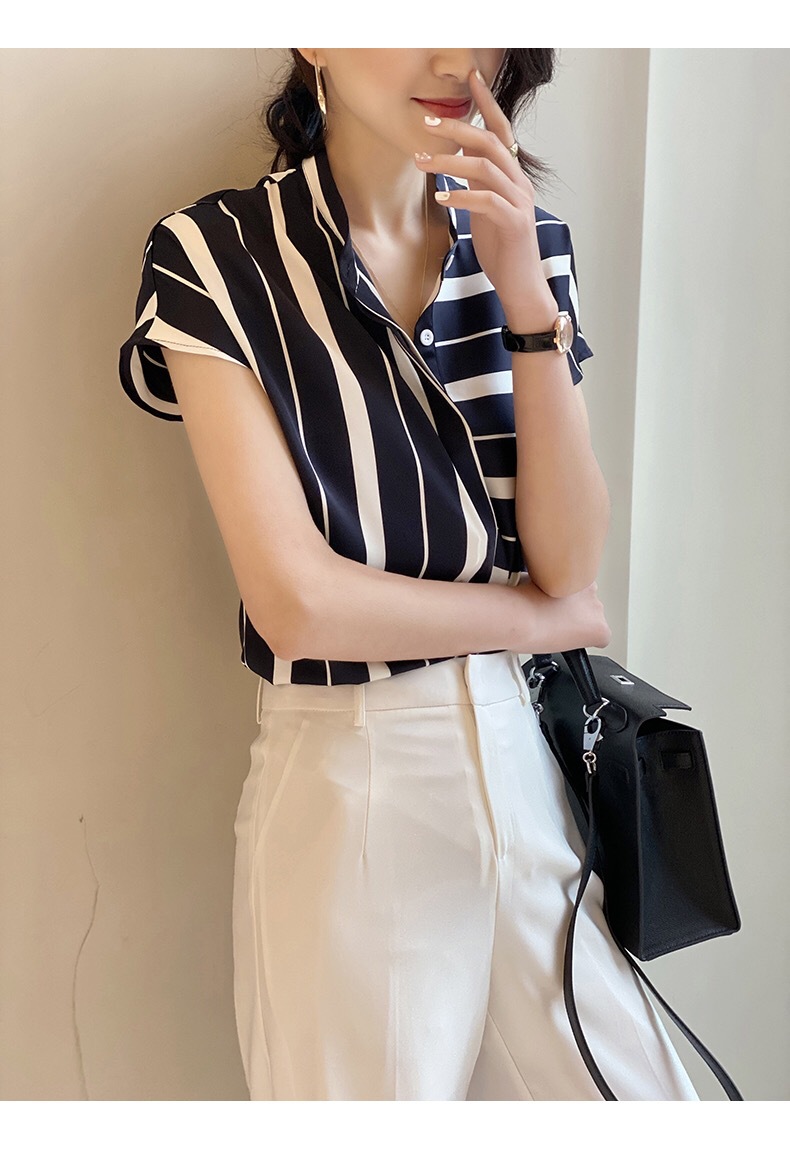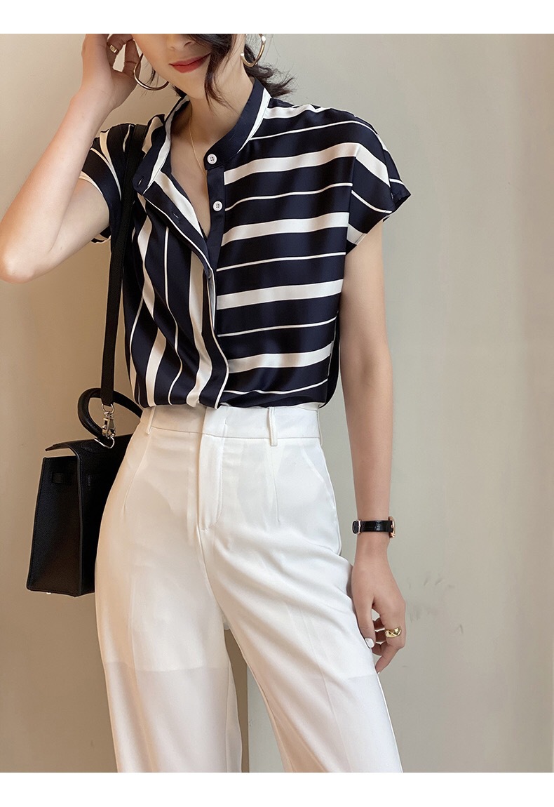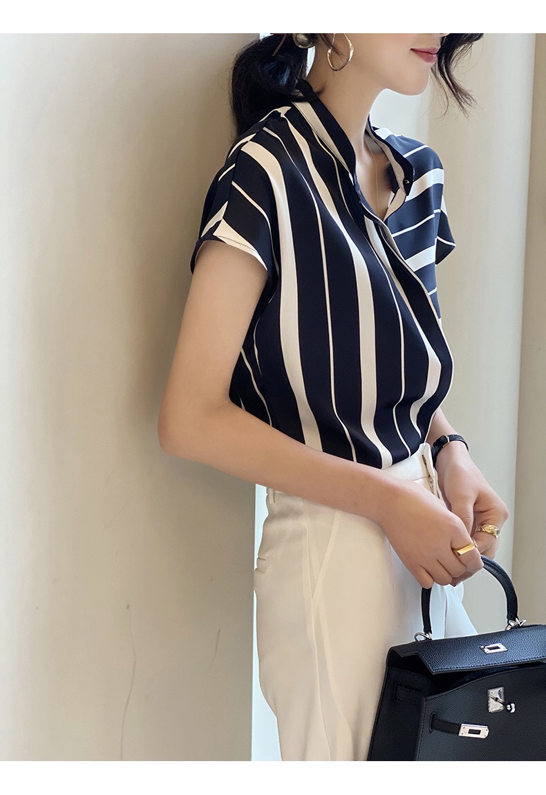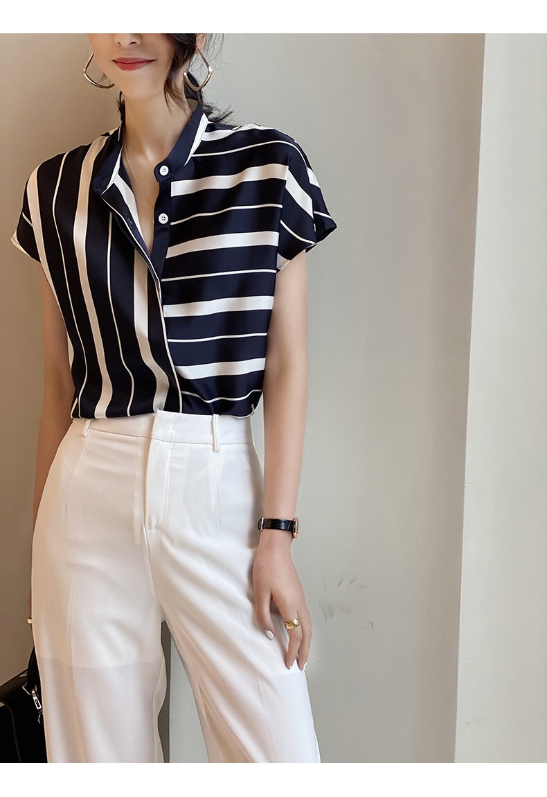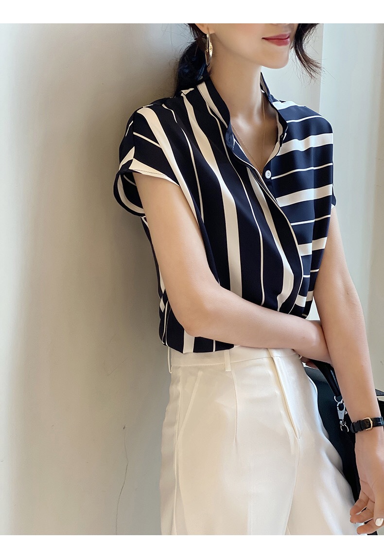 유럽 상품 불규칙한 줄무늬 쉬폰 반팔 셔츠 여성용 2022 봄과 여름 새로운 우아한 스탠드 칼라 반팔 슬림 탑