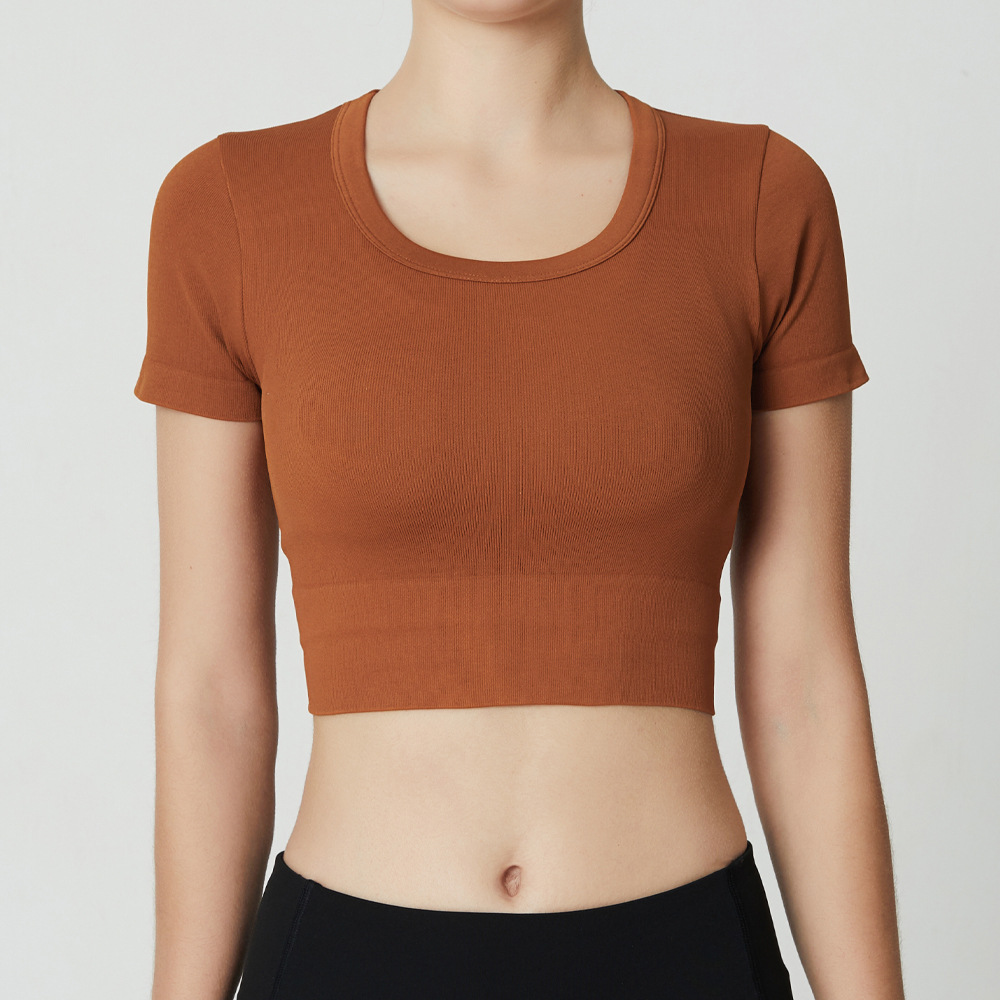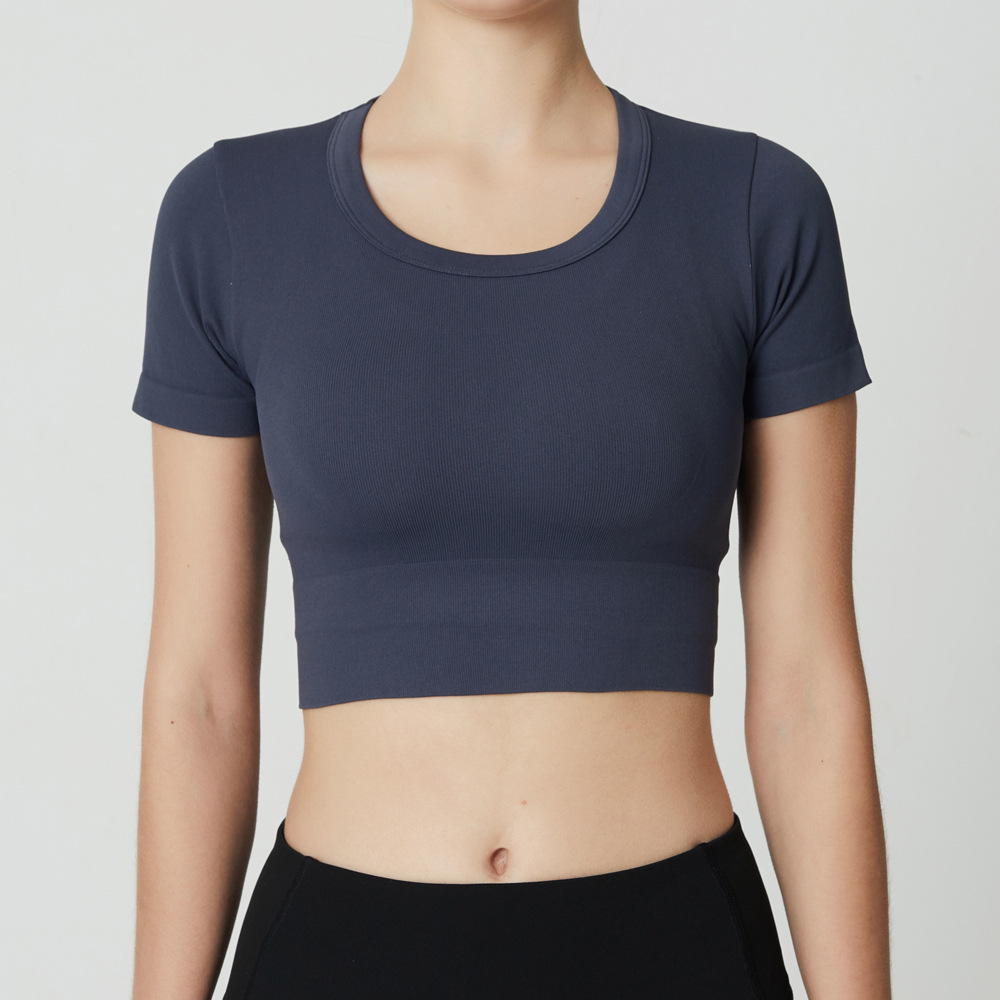 요가 탑 여성용 반팔 스포츠 티셔츠 꽉 끼는 피트니스 의류 탄성 섹시 러닝 속건 봄과 여름 얇은