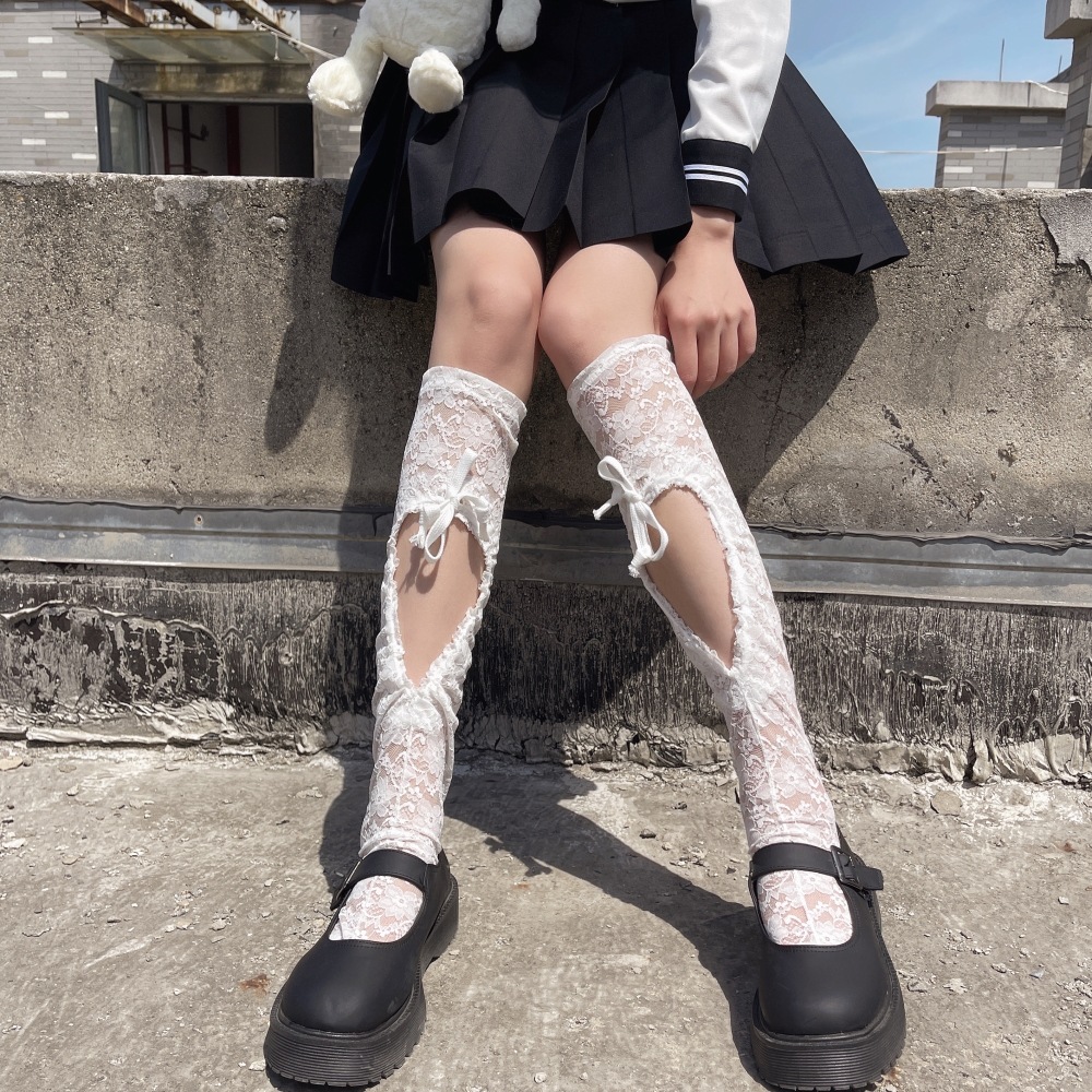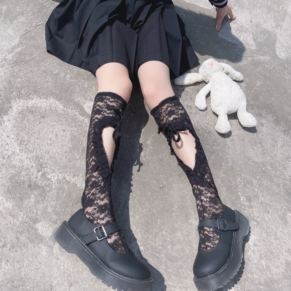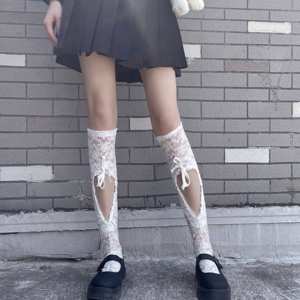 일본 JK 로리타 귀여운 대형 중공 사랑 스트랩 레이스 꽃 자카드 얕은 양말 중간 배럴 다크 인