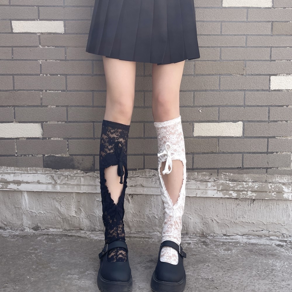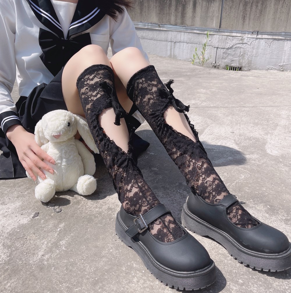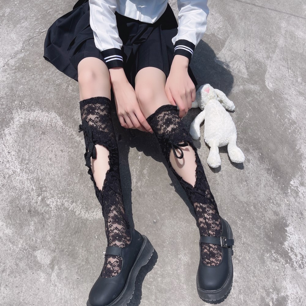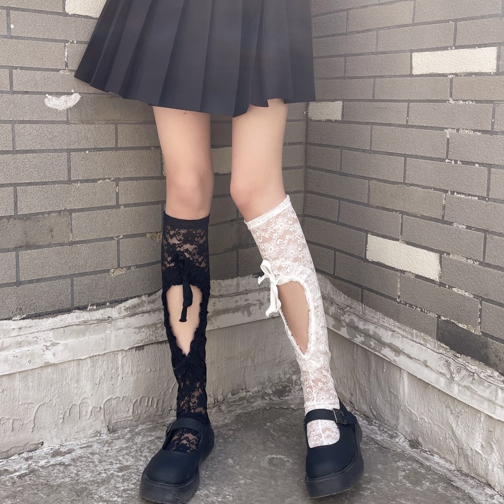 일본 JK 로리타 귀여운 대형 중공 사랑 스트랩 레이스 꽃 자카드 얕은 양말 중간 배럴 다크 인