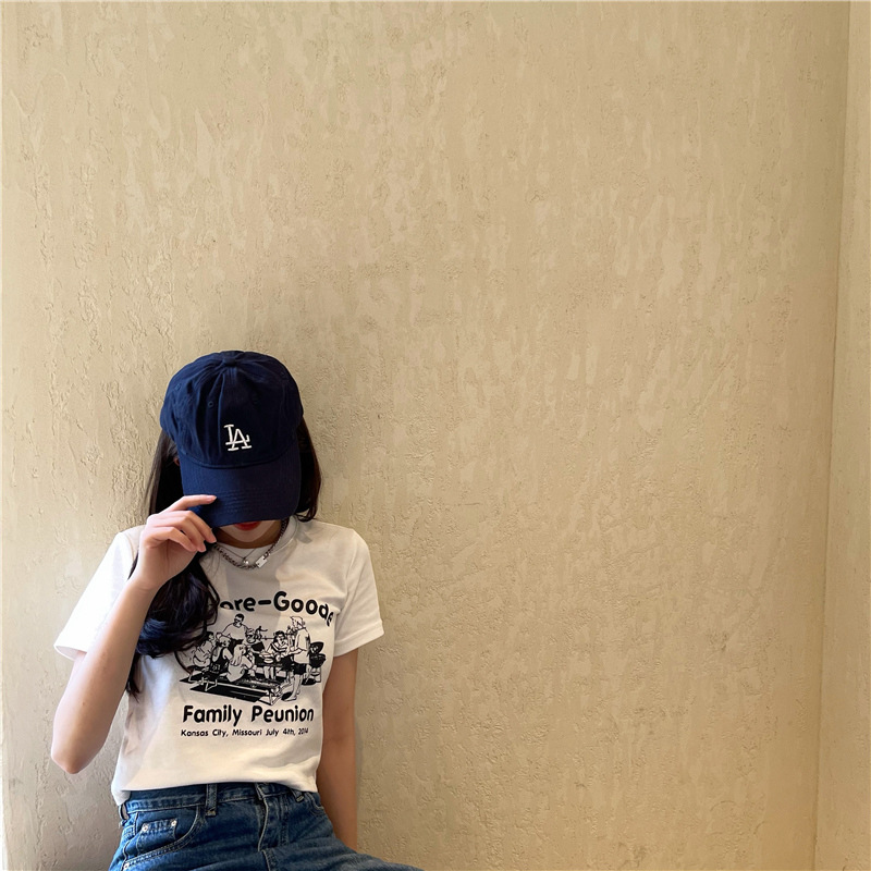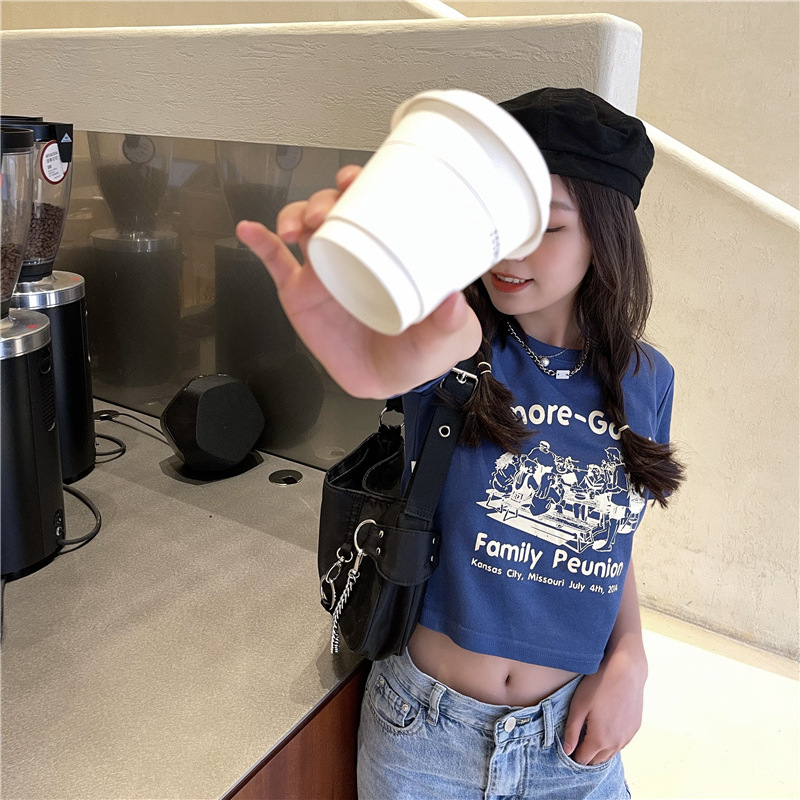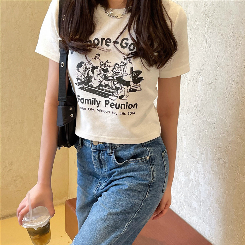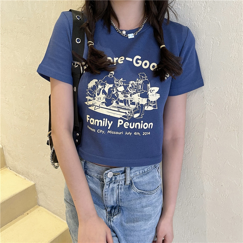 2022 여름 한국 스타일 짧은 슬림핏 반팔 티셔츠 여성용 라운드 넥 하이 웨이스트 배꼽 노출 프린트 베이스 레이어 셔츠 탑 인 트렌디스토어 가기