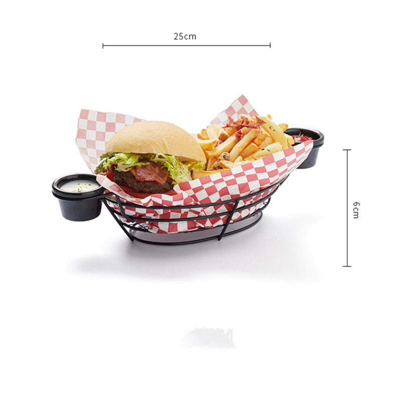 미국 단철 공예 블랙 직사각형 와이어 메쉬 바구니 2 멜라민 그릇 프렌치 프라이 블루 햄버거 프라이드 치킨 더블 그릇