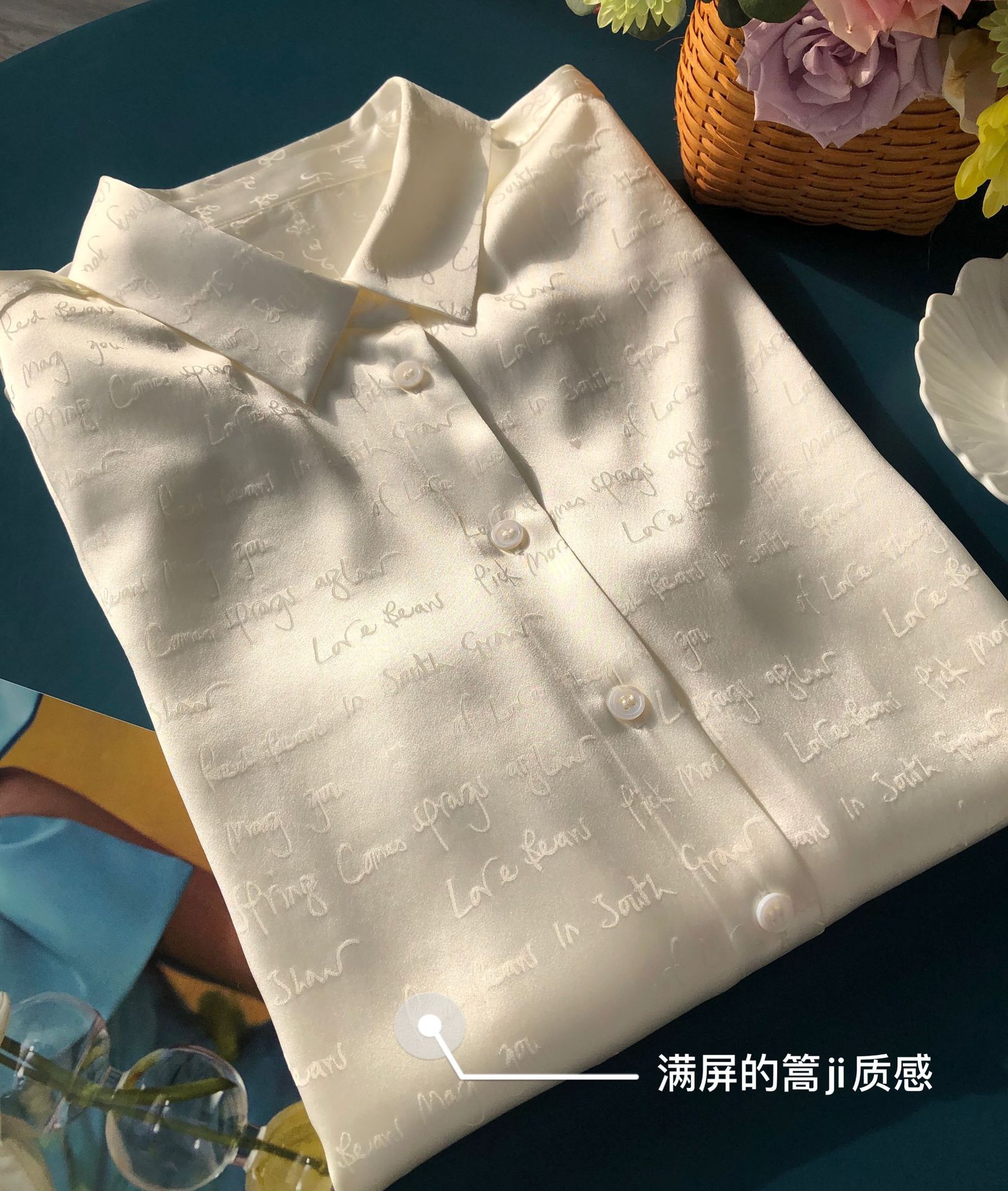 篙颜值 丝滑触感 白底英文字母提花真丝长袖衬衣