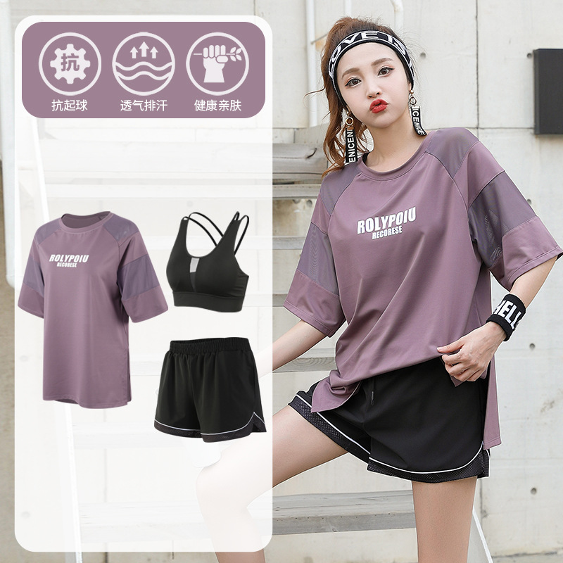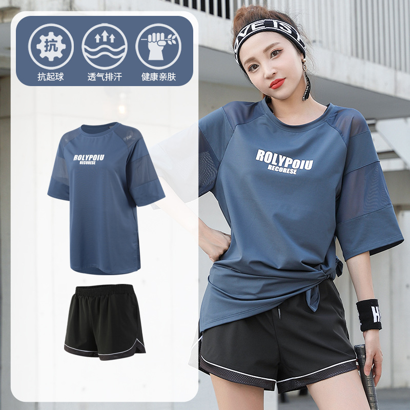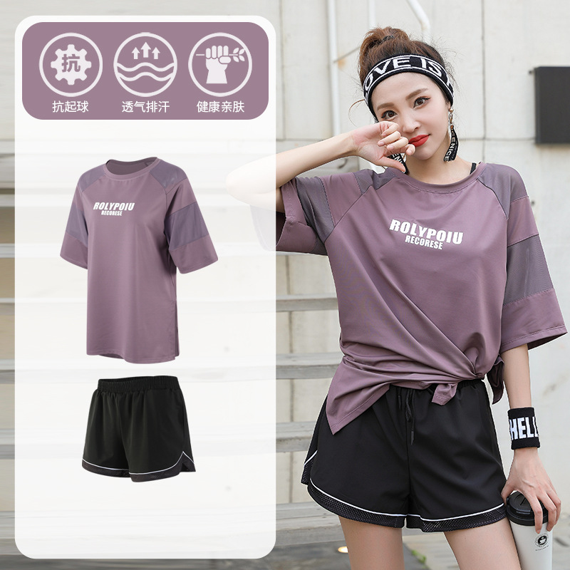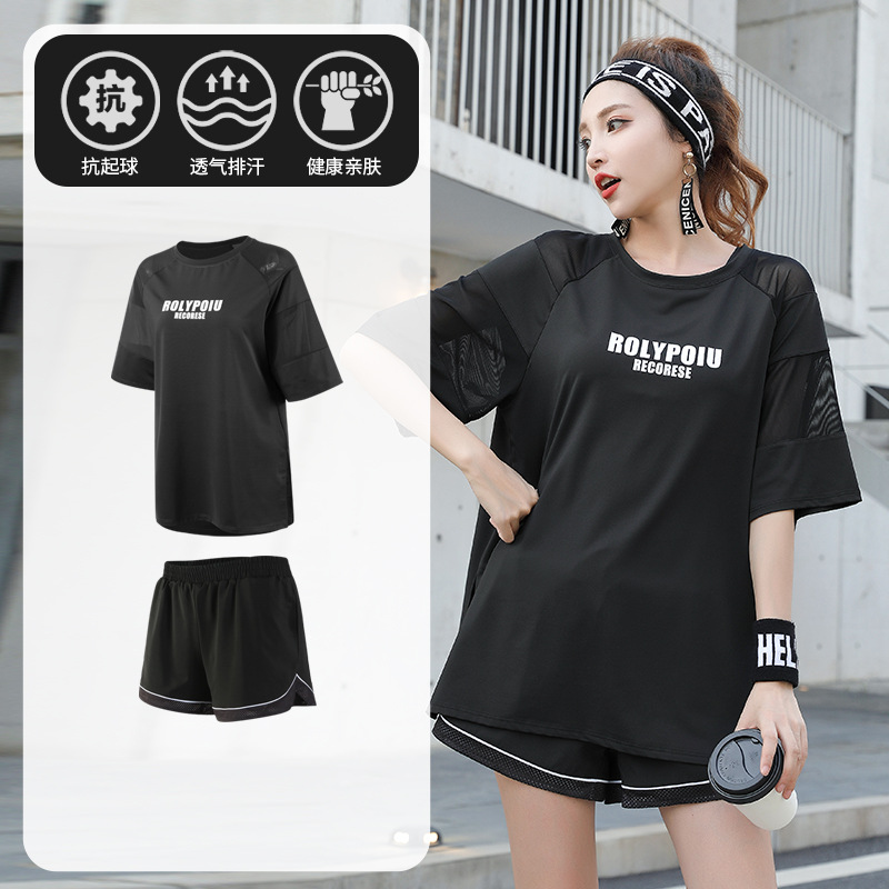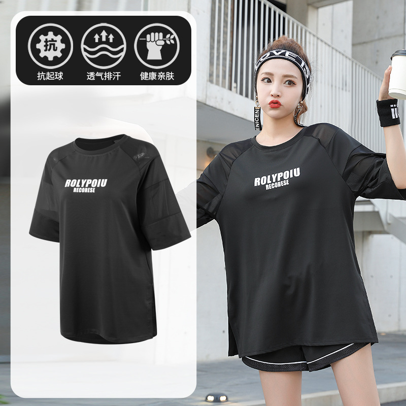 J215 메쉬 요가 의류 여성 플러스 사이즈 240kg 착용 할 수있는 느슨한 짧은 소매 여성 가슴 패드 달리기 스포츠 운동 옷
