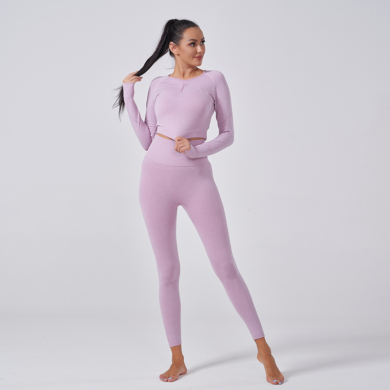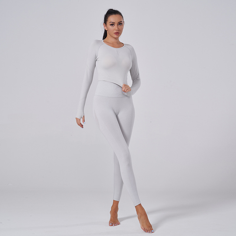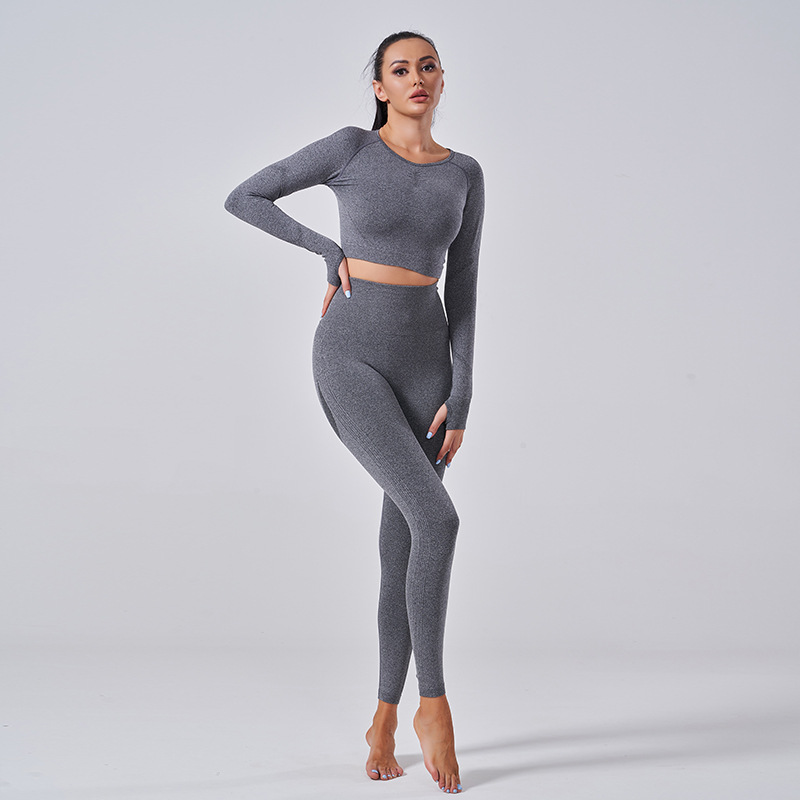 유럽과 미국 원활한 요가 의류 크로스 국경 긴 소매 스포츠 세트 아마존 속건 피트니스 의류 엉덩이 리프팅 요가 세트 여성