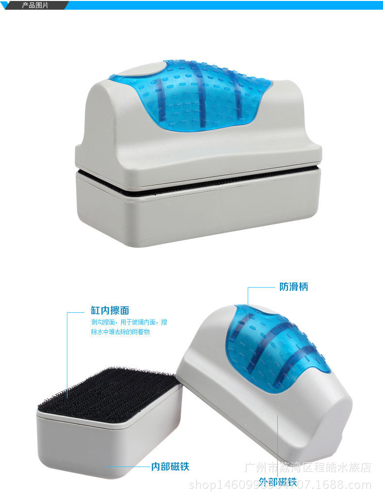3、本品采用强力磁铁制造而成,使用时只需将其中一块放入水族箱内,另一块在缸外即可吸附在一起,移动外面一块的同时带动里面一块,可以水族箱里外的一次性清洁,内部采用悬浮式设计,避免意外落入水族箱内不方便取。