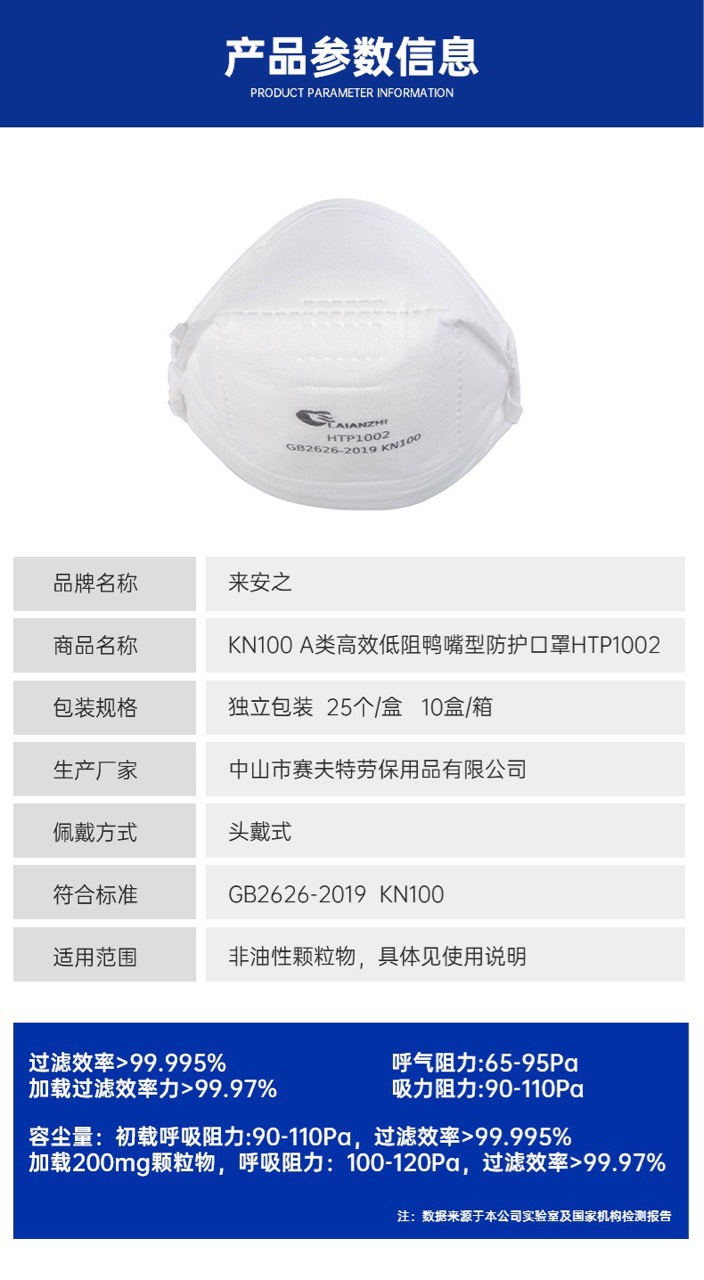 Lai'an의 HTP1002 덕빌형 고효율 저저항 접이식 보호 마스크 KN100 방진 마스크스토어 가기