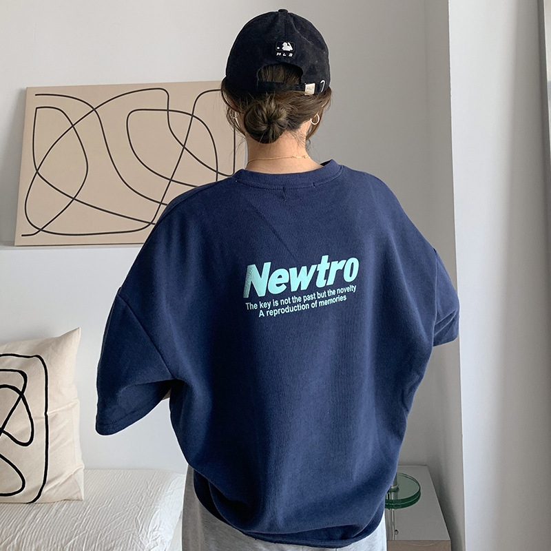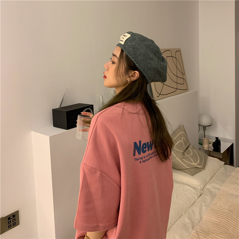 2025 새로운 여름 대학 스타일 라운드 넥 중간 길이 전면 및 후면 문자 인쇄 느슨한 반팔 티셔츠 여성상의스토어 가기