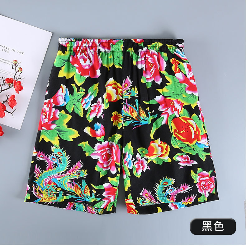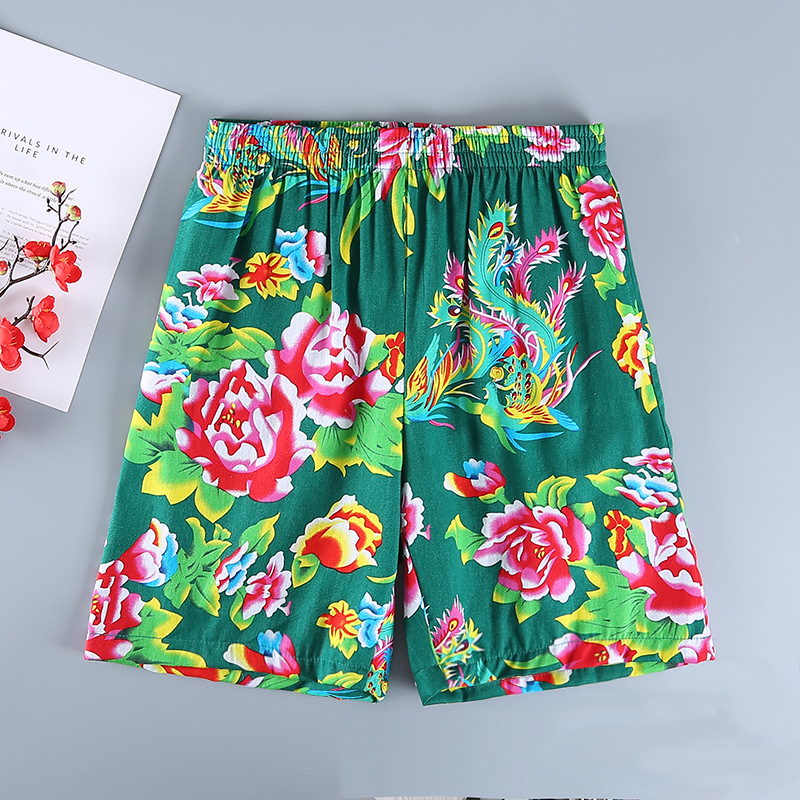 동북 꽃 천 유행 얇은 여름 여성 반바지 중국 스타일 느슨한 스트레이트 스포츠 캐주얼 와이드 레그 팬츠