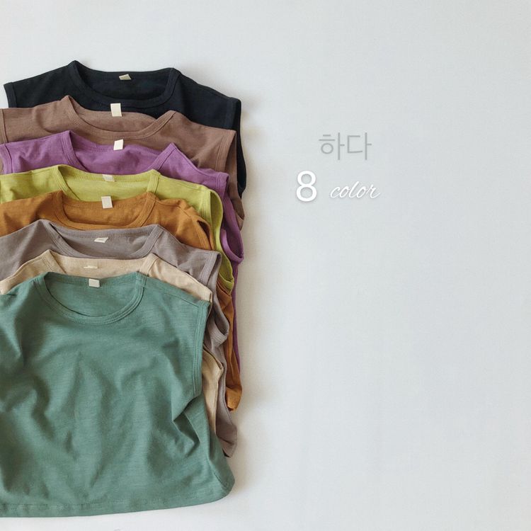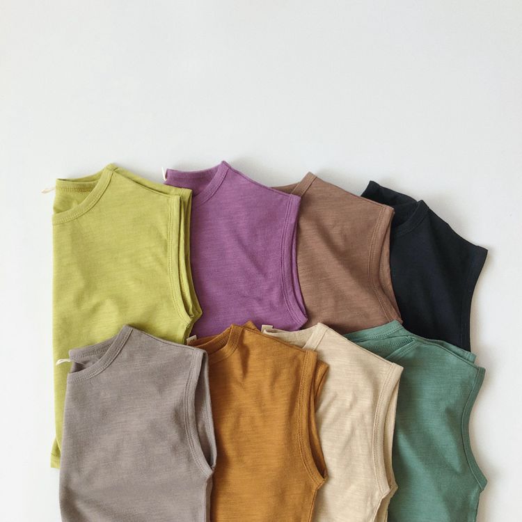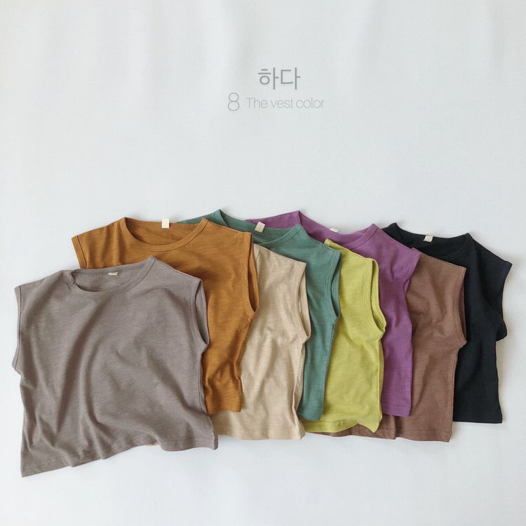 한국 스타일 어린이 조끼 여름 부드러운 왁스 슬럽 면 민소매 어깨 티셔츠 조끼 소년과 소녀 라운드 넥 겉옷 모리 스타일스토어 가기