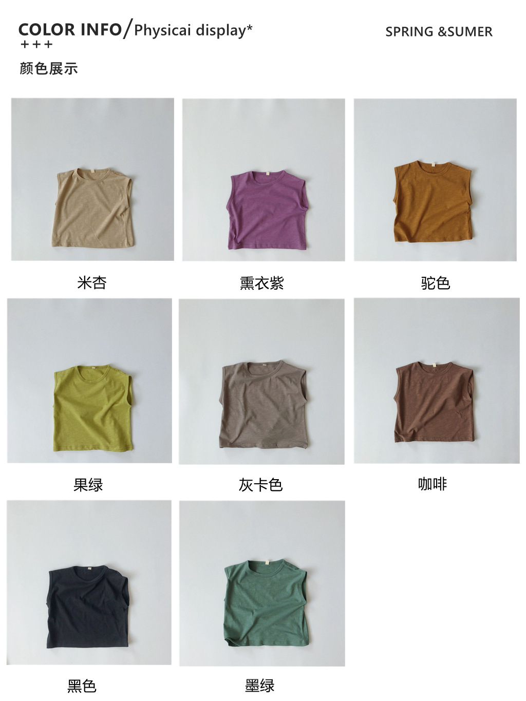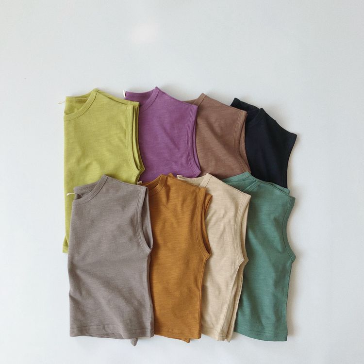 한국 스타일 어린이 조끼 여름 부드러운 왁스 슬럽 면 민소매 어깨 티셔츠 조끼 소년과 소녀 라운드 넥 겉옷 모리 스타일