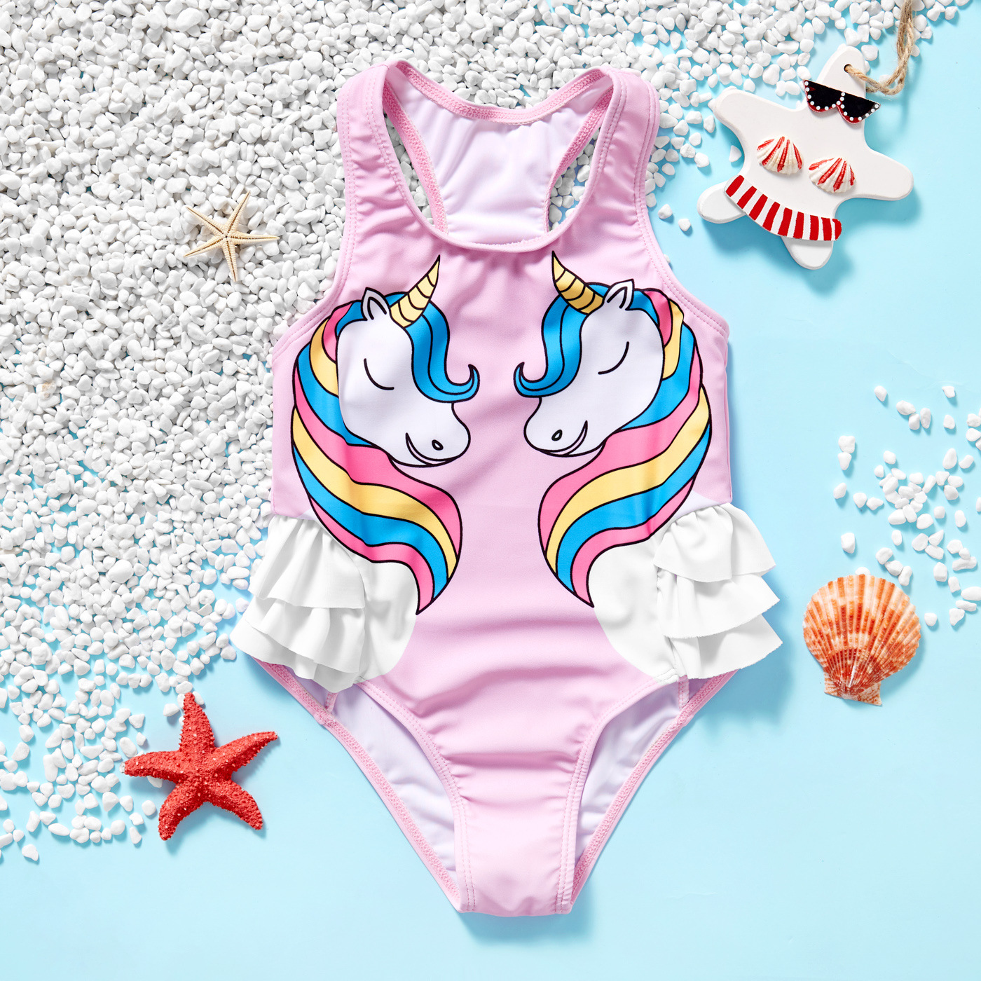 새로운 소녀 원피스 수영복 편안한 만화 주름 유니콘 달콤한 귀여운 어린이 온천 수영복