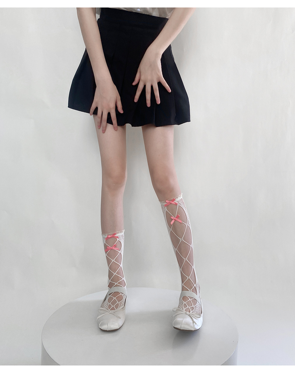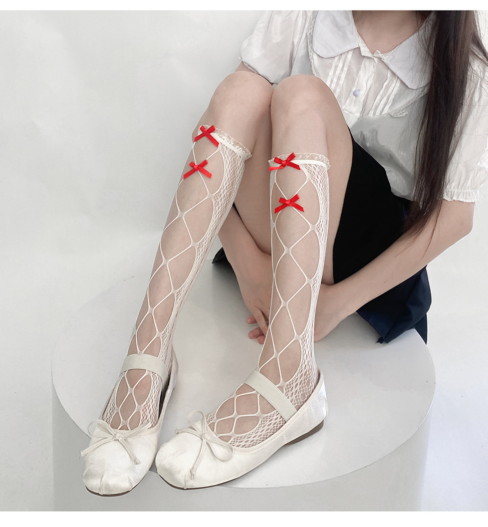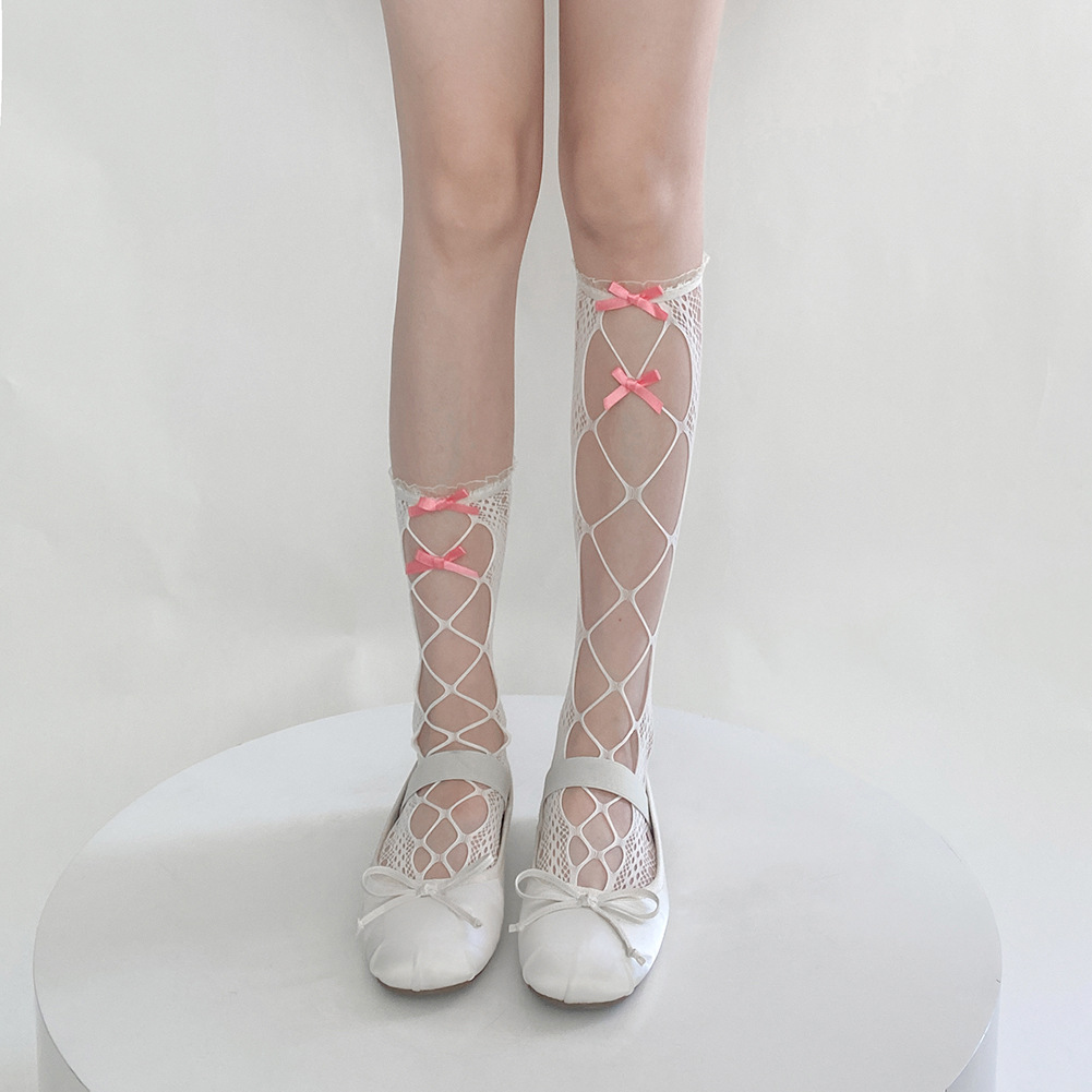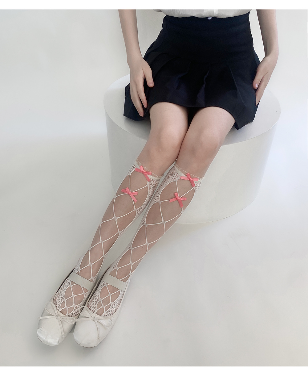 일본 요정 양말 귀여운 활 다크 중공 대형 그리드 자카드 그물 양말 우유 흰색 커프 양말 중간 튜브
