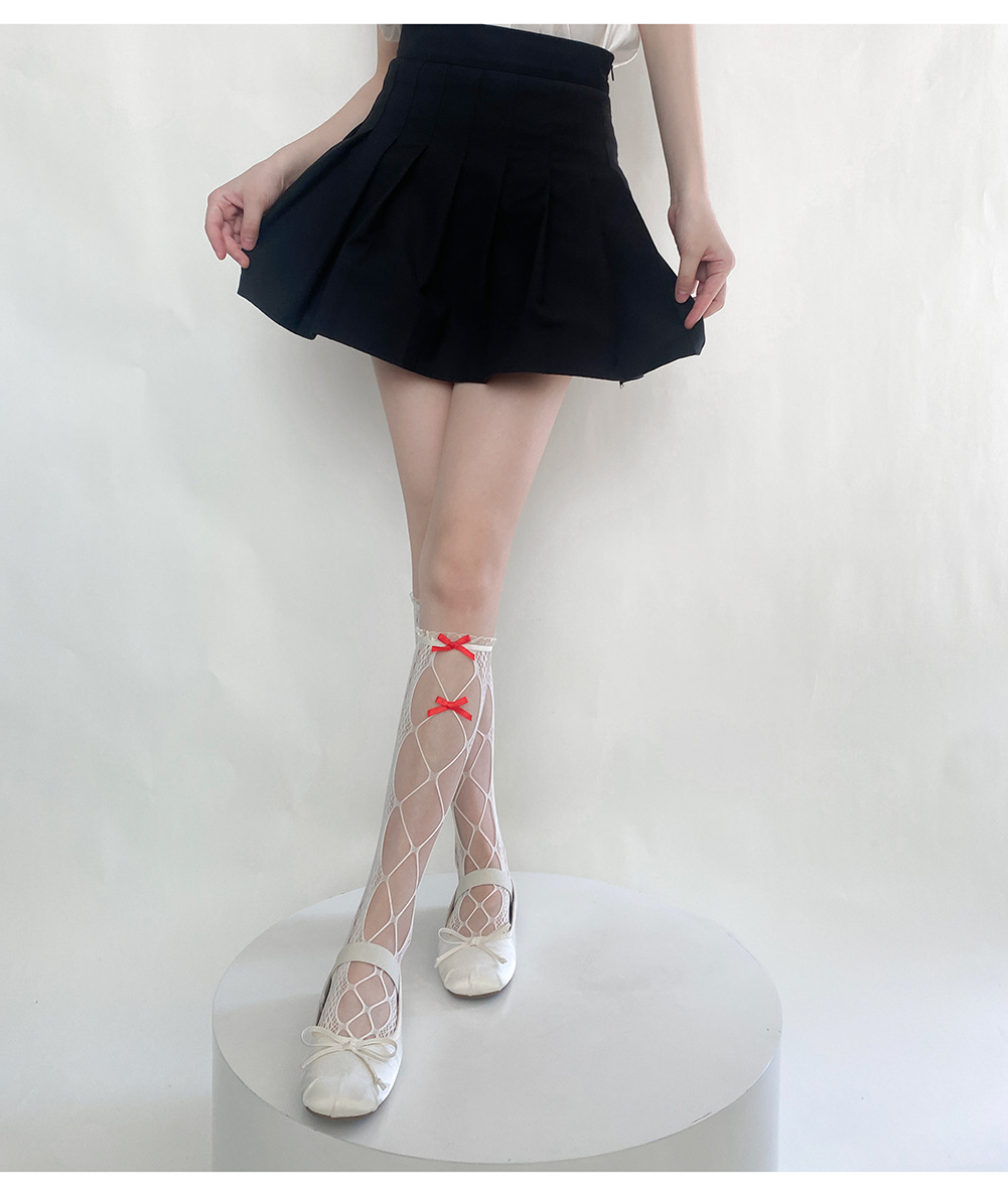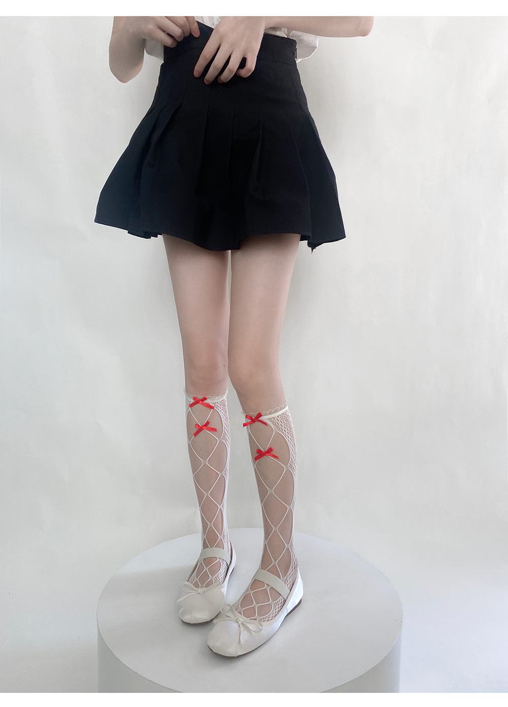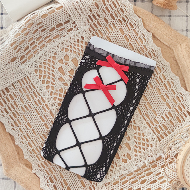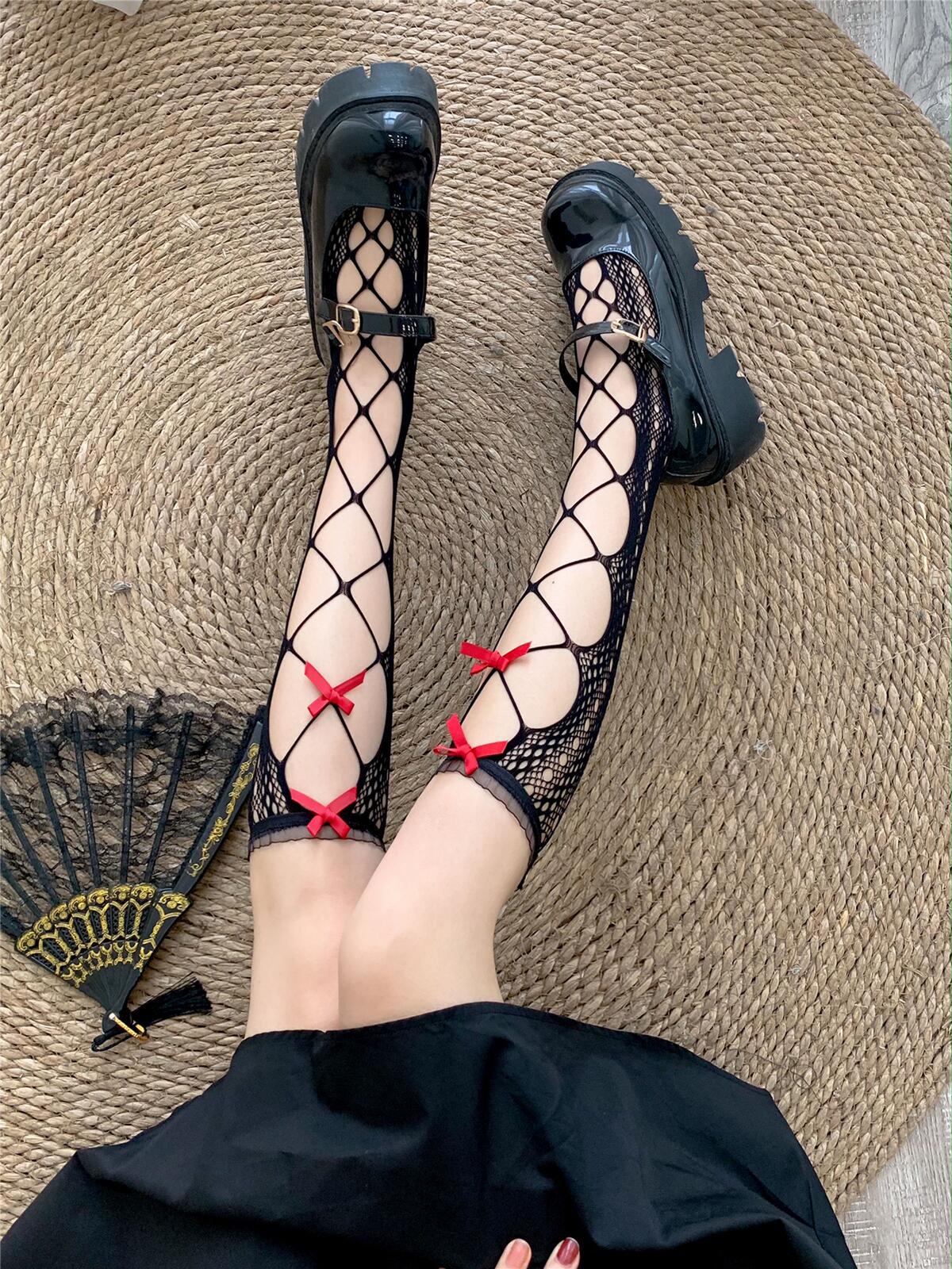 일본 요정 양말 귀여운 활 다크 중공 대형 그리드 자카드 그물 양말 우유 흰색 커프 양말 중간 튜브