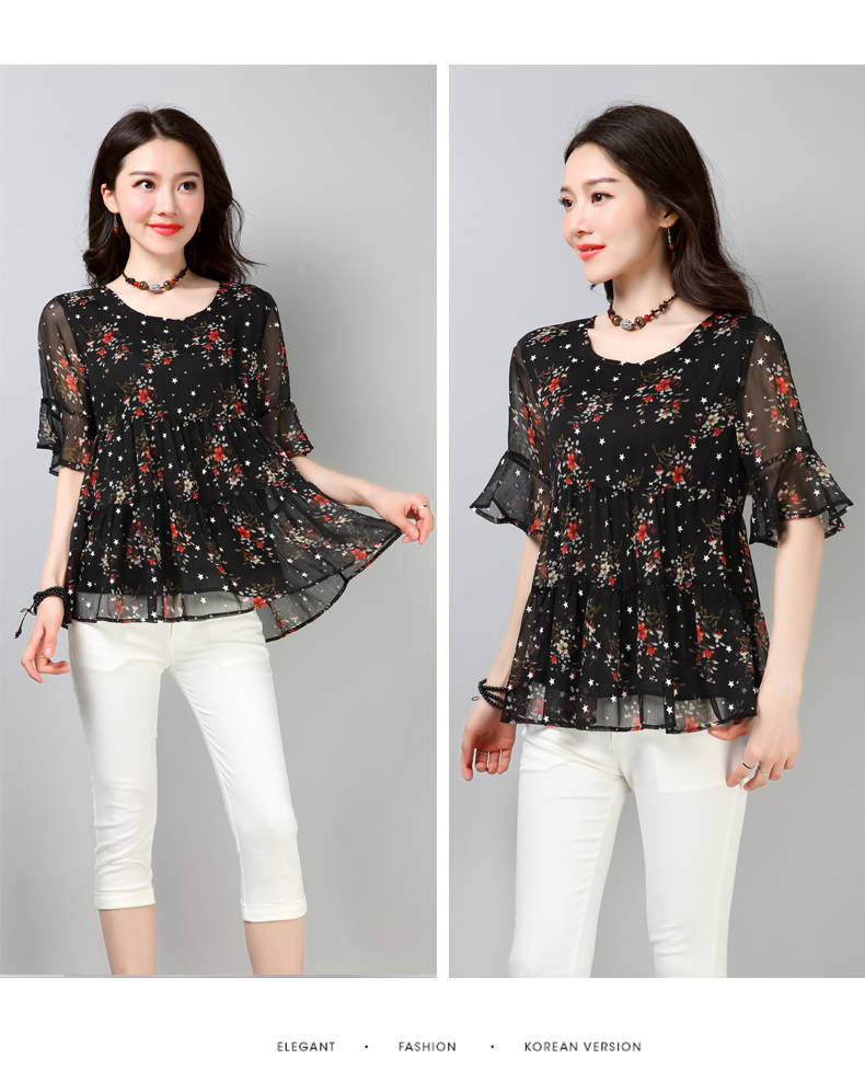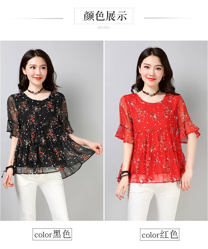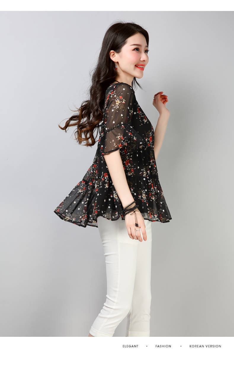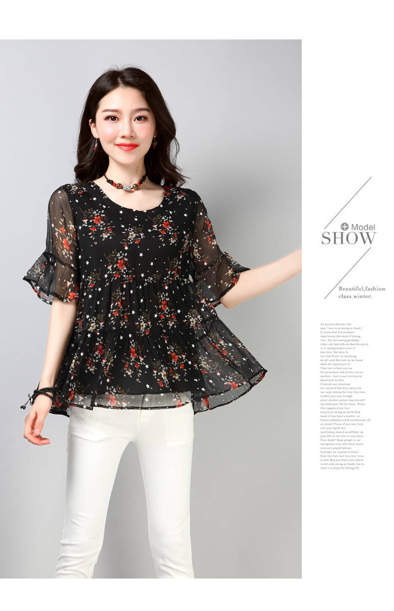 200 진 통통녀 쉬폰 셔츠 반팔 플러스 사이즈 여자의 최고 꽃 느슨한 T 크루넥 세련된 셔츠스토어 가기