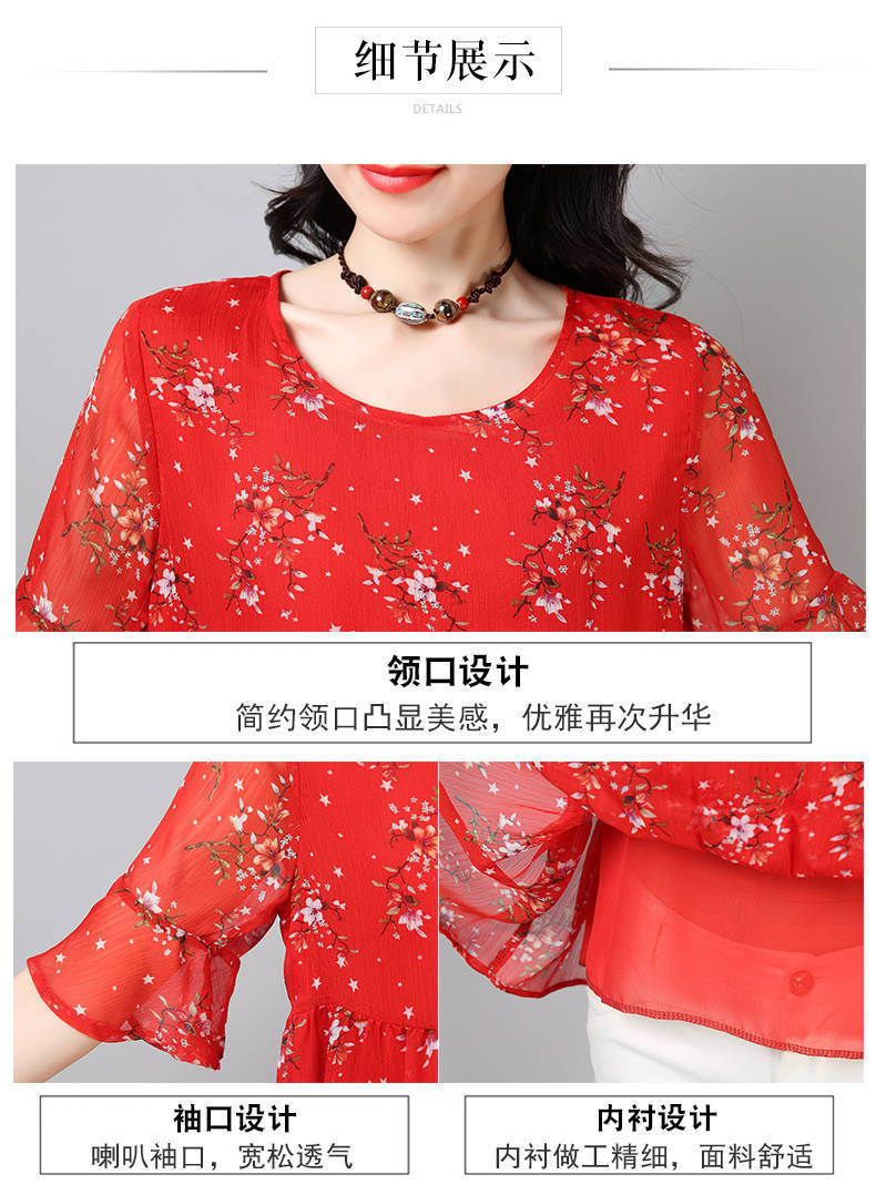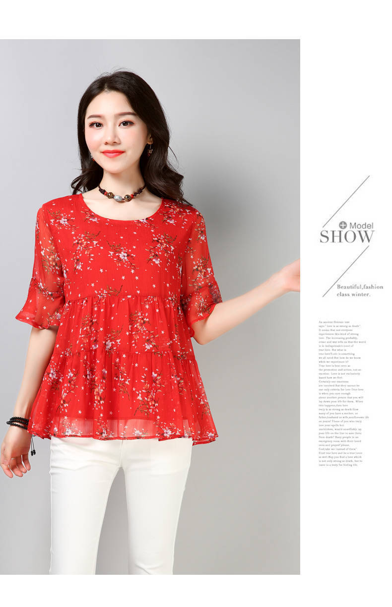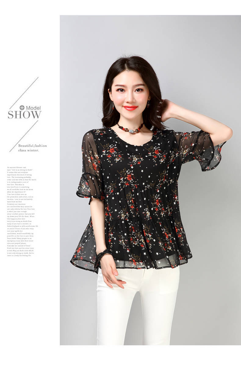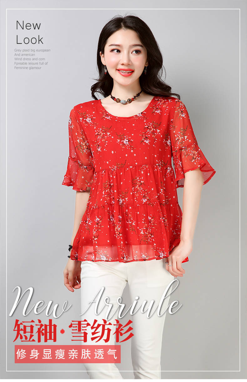 200 진 통통녀 쉬폰 셔츠 반팔 플러스 사이즈 여자의 최고 꽃 느슨한 T 크루넥 세련된 셔츠스토어 가기