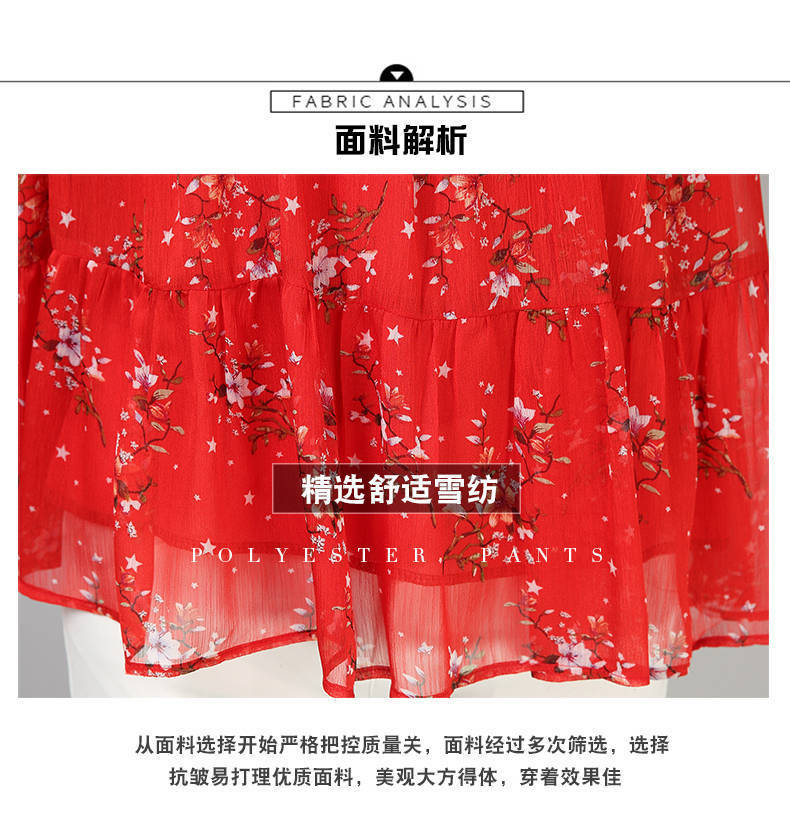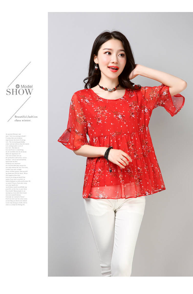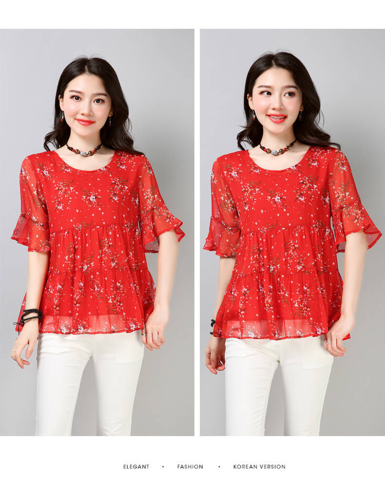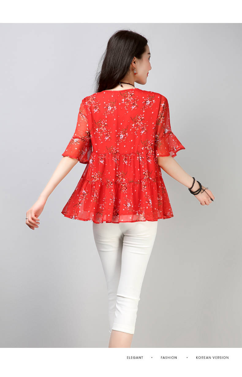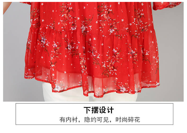 200 진 통통녀 쉬폰 셔츠 반팔 플러스 사이즈 여자의 최고 꽃 느슨한 T 크루넥 세련된 셔츠