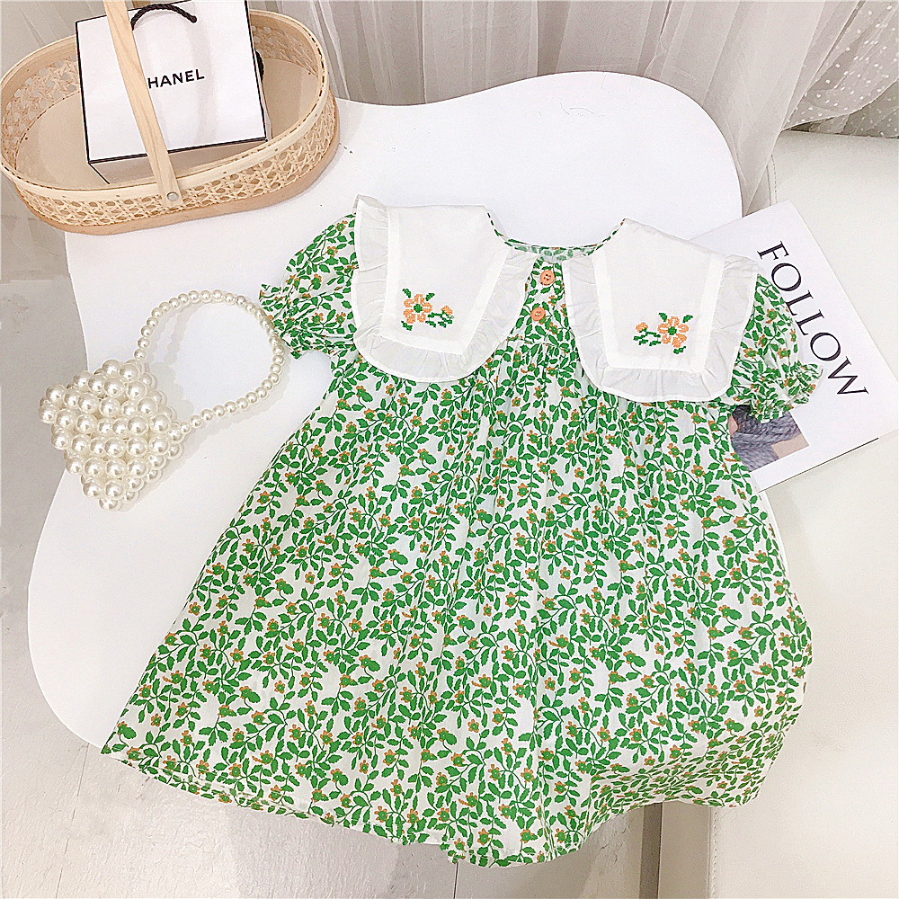 2023 아동복 여름 새 소녀 원피스 한국 공주 원피스 녹색 반팔 대형 옷깃 인형 원피스 꽃스토어 가기