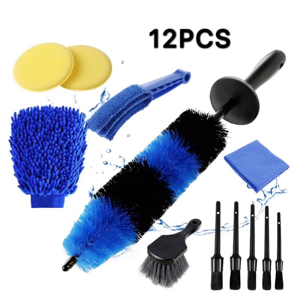 【12件汽车刷套件】此车轮刷套件包括1件17英寸长的轮辋刷、5种不同尺寸的汽车装饰刷、1件轮胎刷、1件排气刷、1件3030cm汽车清洁毛巾、1个58g左右手套和2片海绵片。