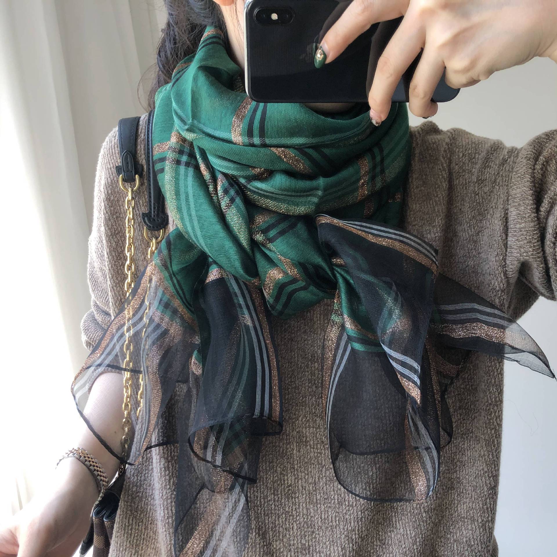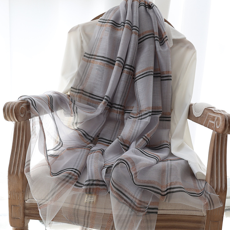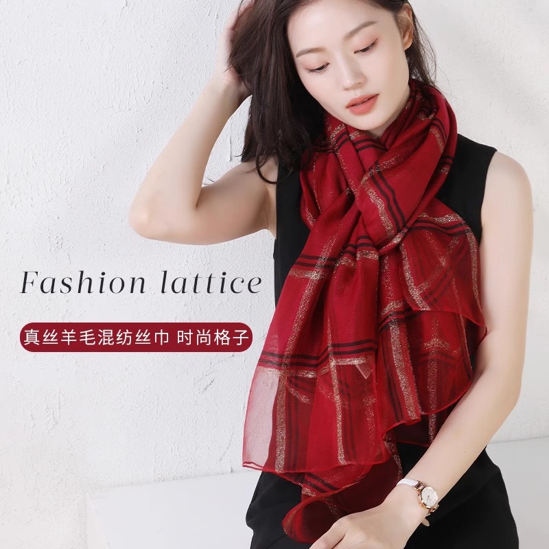 봄 가을 실크 울 다용도 스카프 여성용 금사 큰 격자무늬 실크 스카프 뽕나무 실크 얇은 숄 거즈 스카프 자카드 체크무늬스토어 가기