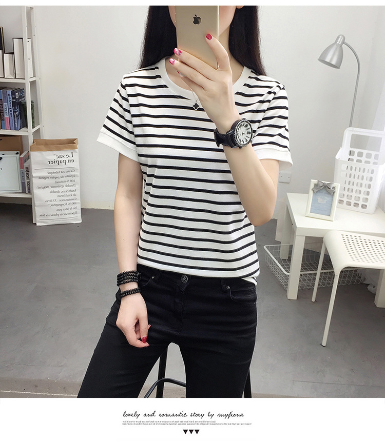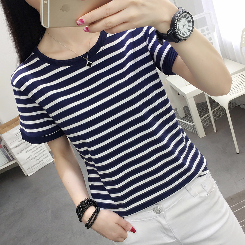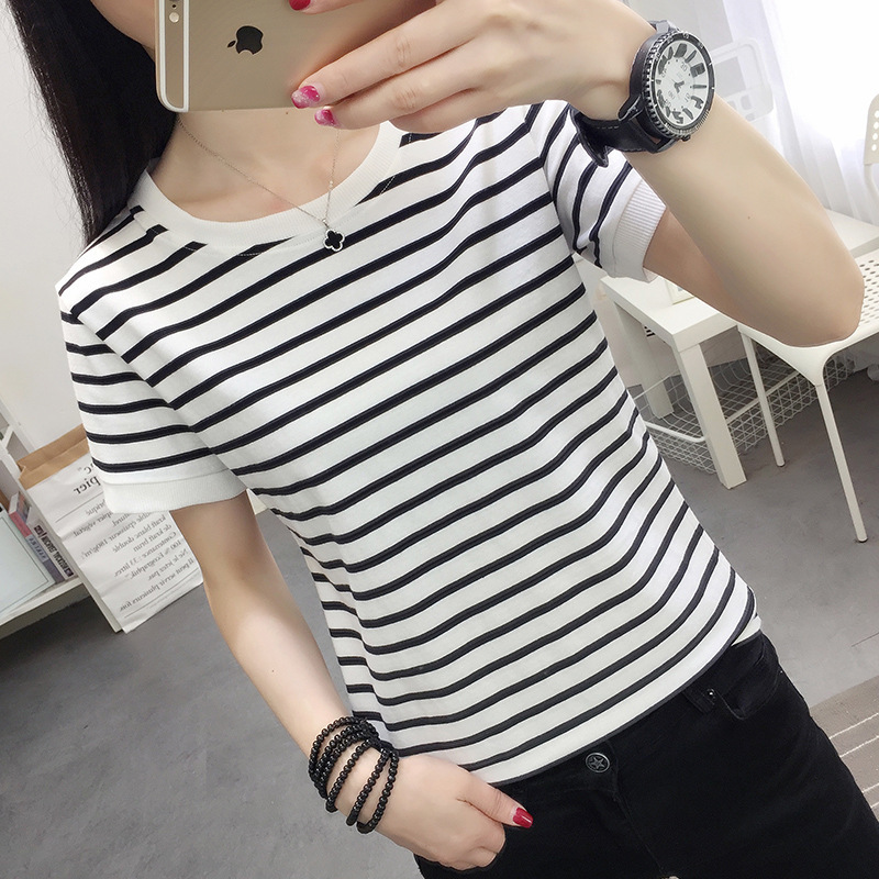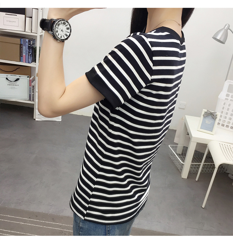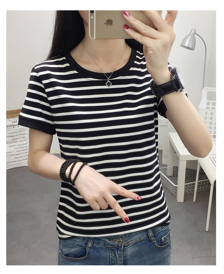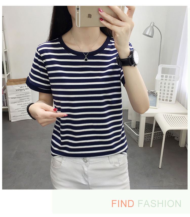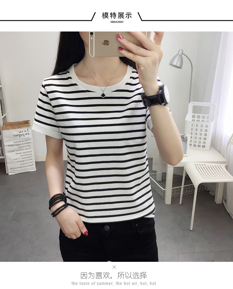 스트라이프 반팔 티셔츠 여성용 한국식 루즈한 인 트렌디 여름 2021 신상품 웨스턴 스타일 플러스 사이즈 여성용 탑 티셔츠스토어 가기