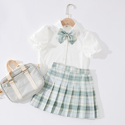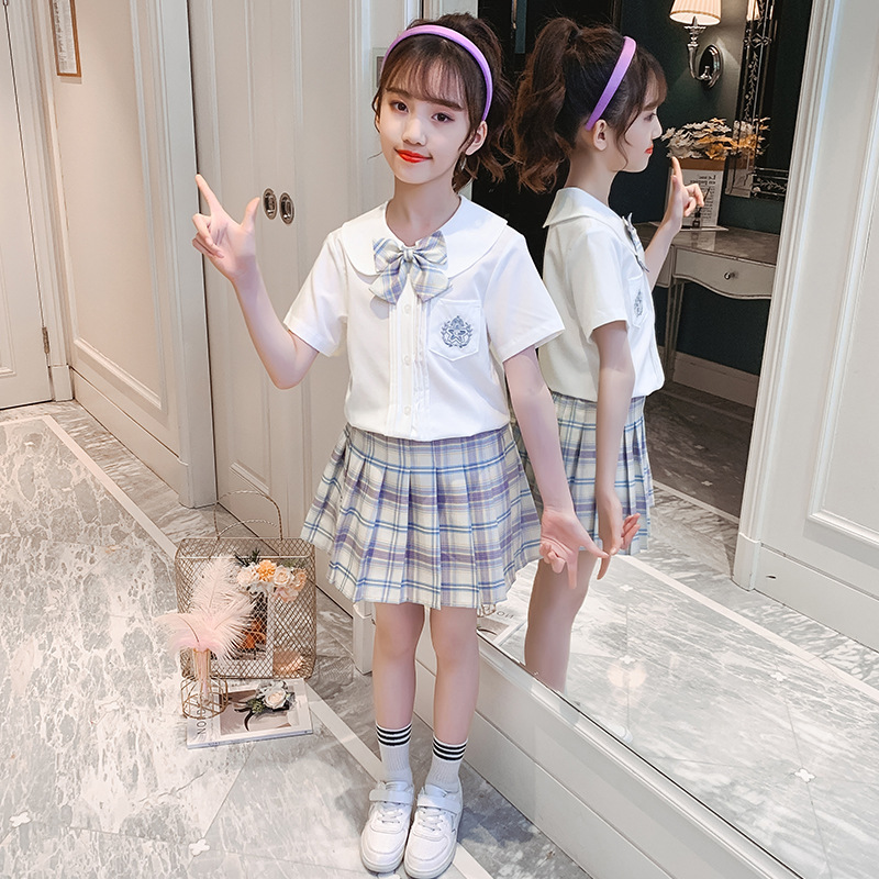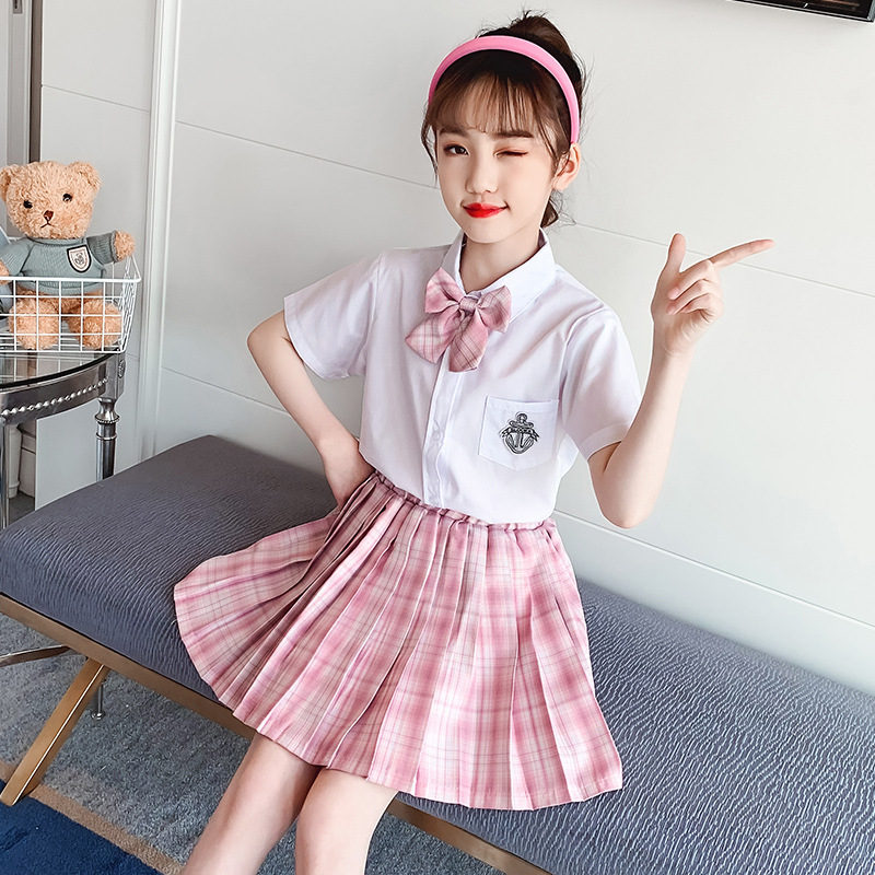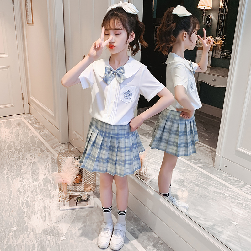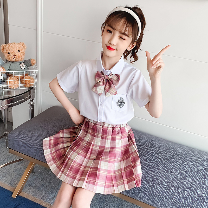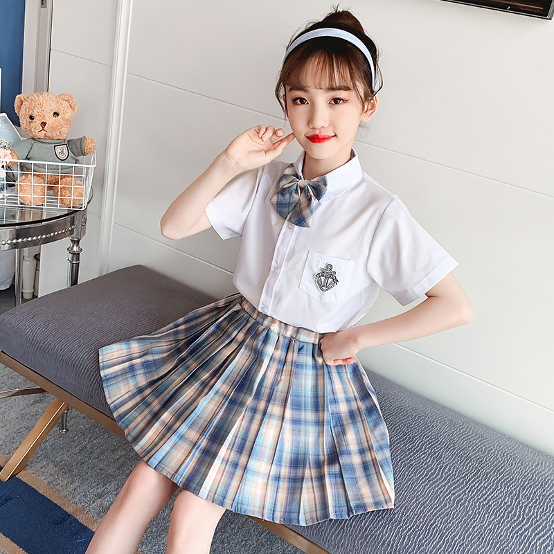 JK 유니폼 아동 여아 셔츠 여름 일본 정통 초등학생 체크 무늬 스커트 정장 대학 스타일 플리츠 스커트 풀 세트