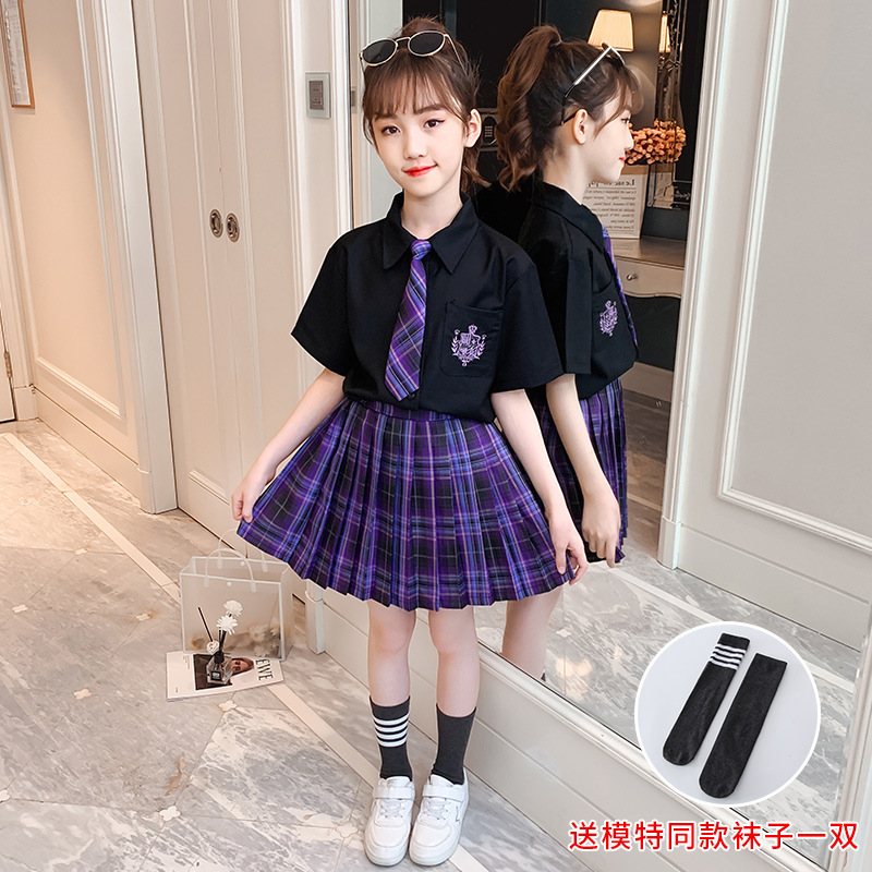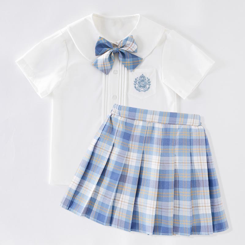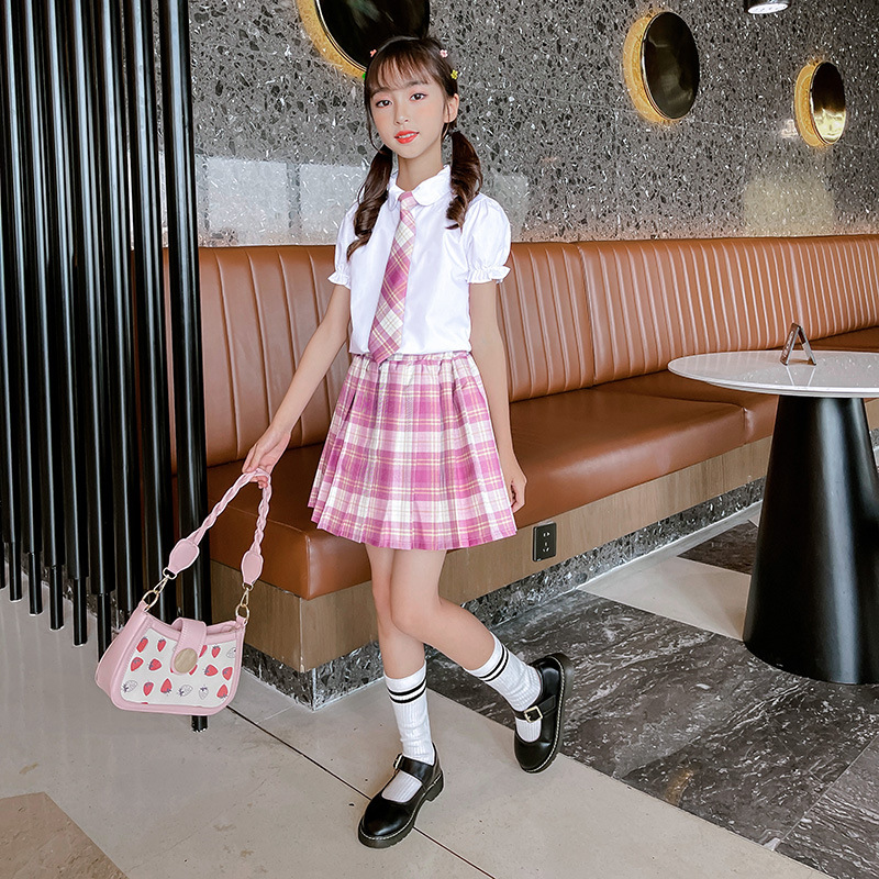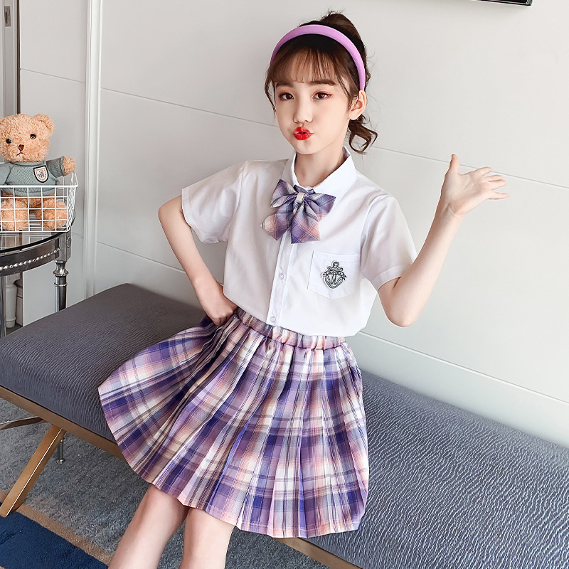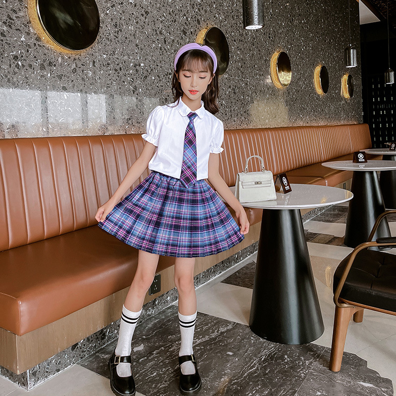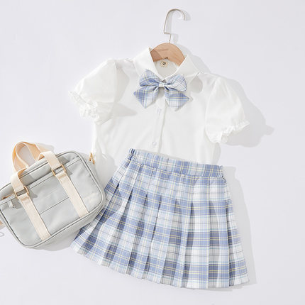 JK 유니폼 아동 여아 셔츠 여름 일본 정통 초등학생 체크 무늬 스커트 정장 대학 스타일 플리츠 스커트 풀 세트