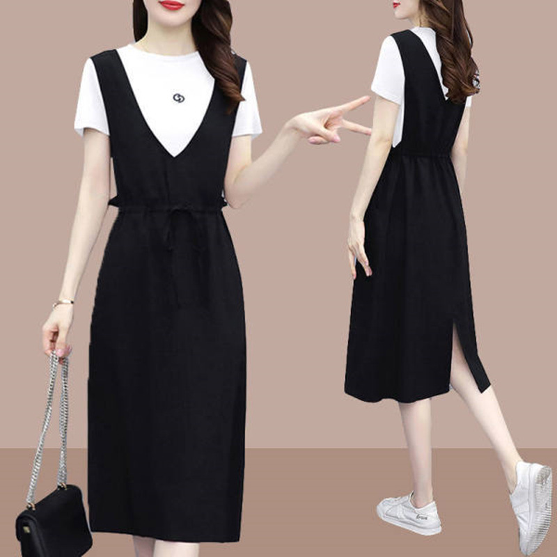 유럽 역 2025 여름 새 스타일 중간 길이 느슨한 슬리밍 가짜 투피스 서스펜더 스커트 여성용 캐주얼 드레스스토어 가기