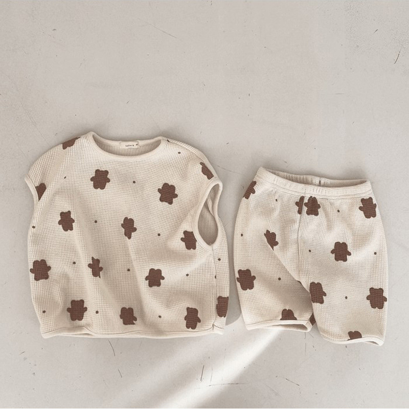 한국식 여름 아기 민소매 만화 귀여운 티셔츠 바지 투피스 아기 와플 느슨한 캐주얼 세트스토어 가기