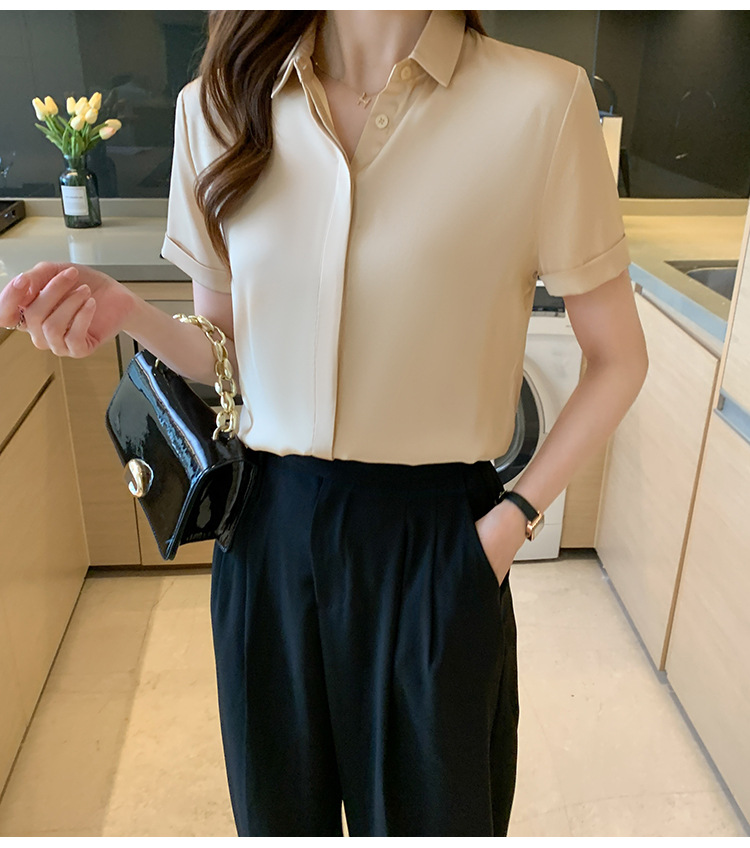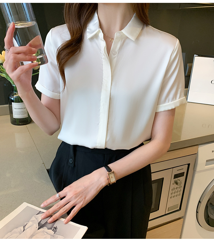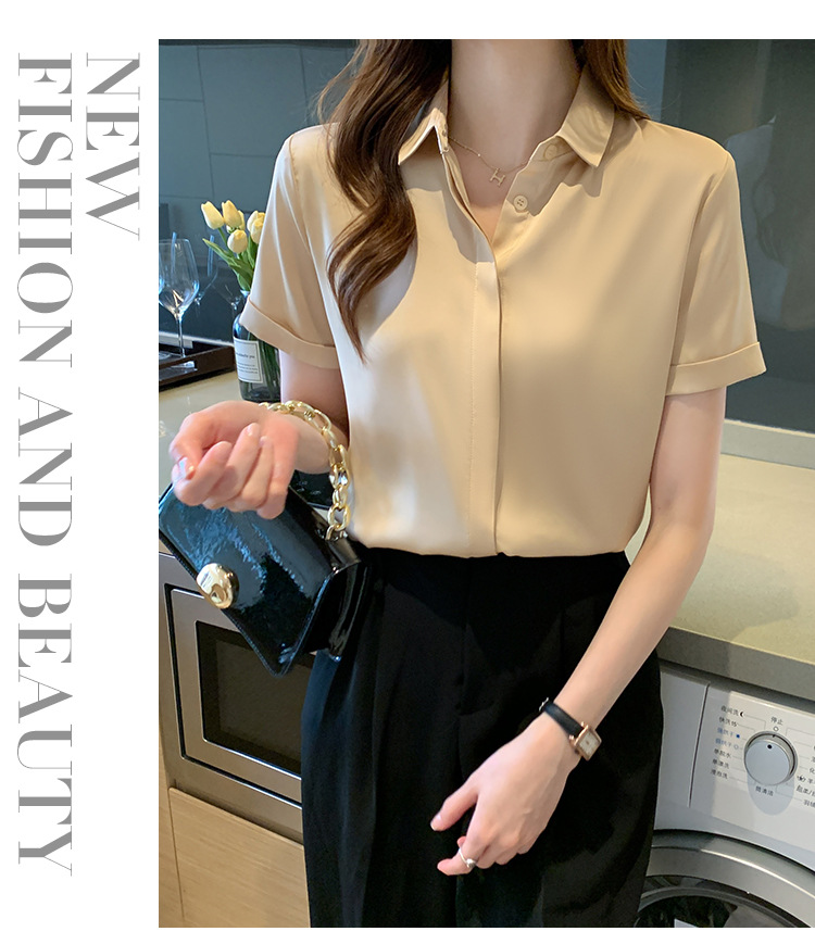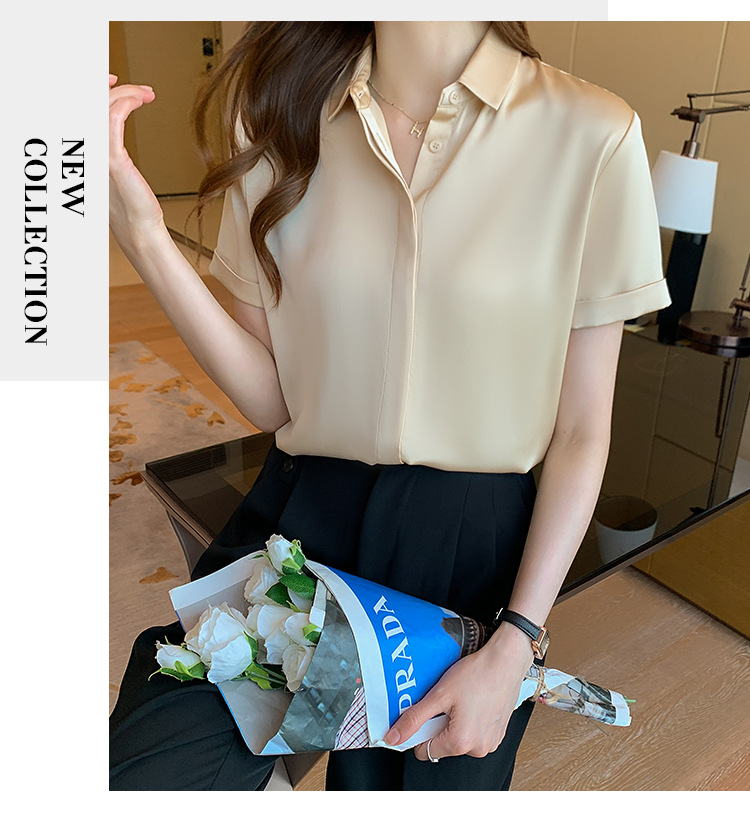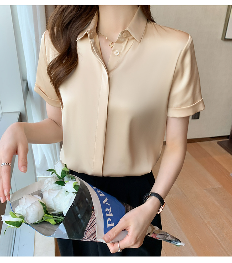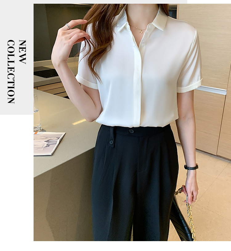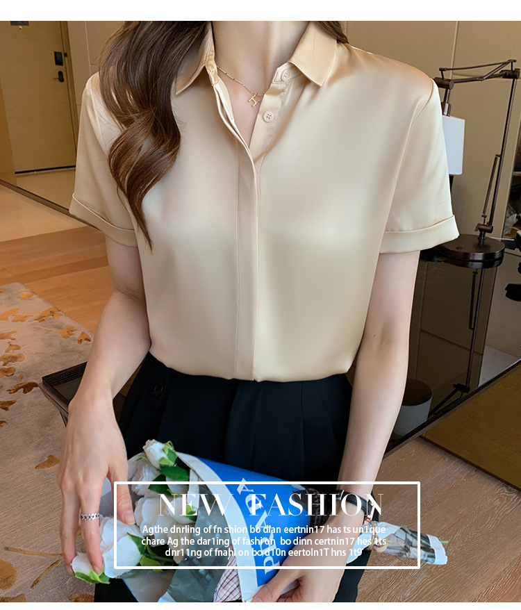 헤비 새틴 반팔 셔츠 여성용 2023 여름 새로운 디자인 센스 라이트 성숙한 전문 셔츠 쉬폰 여성 탑스토어 가기