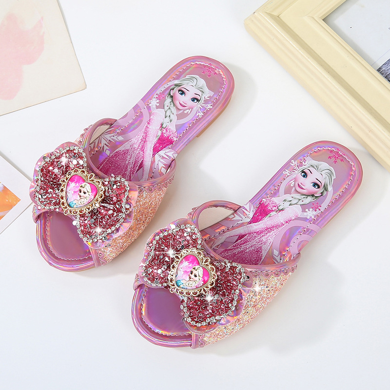 여자 엘사 공주 슬리퍼 2025 귀여운 활 스팽글 부드러운 바닥 어린이 샌들 초등 및 중등 학생 공연 신발스토어 가기