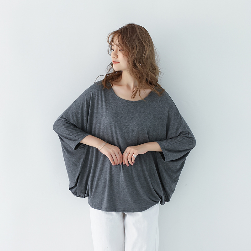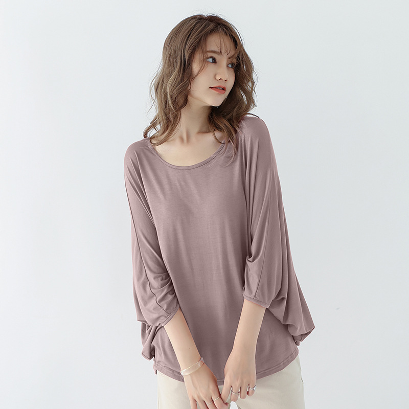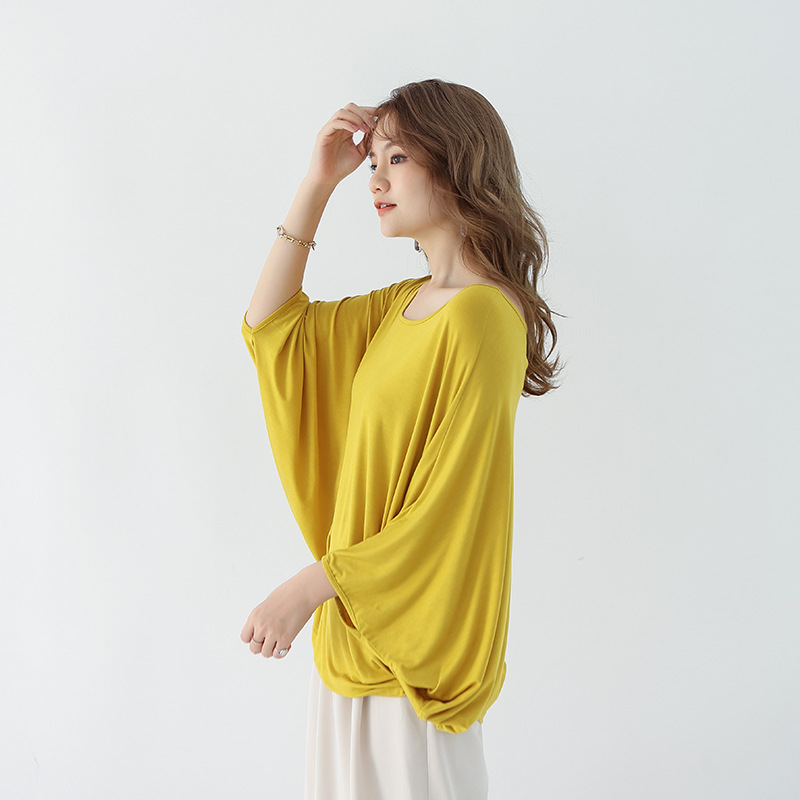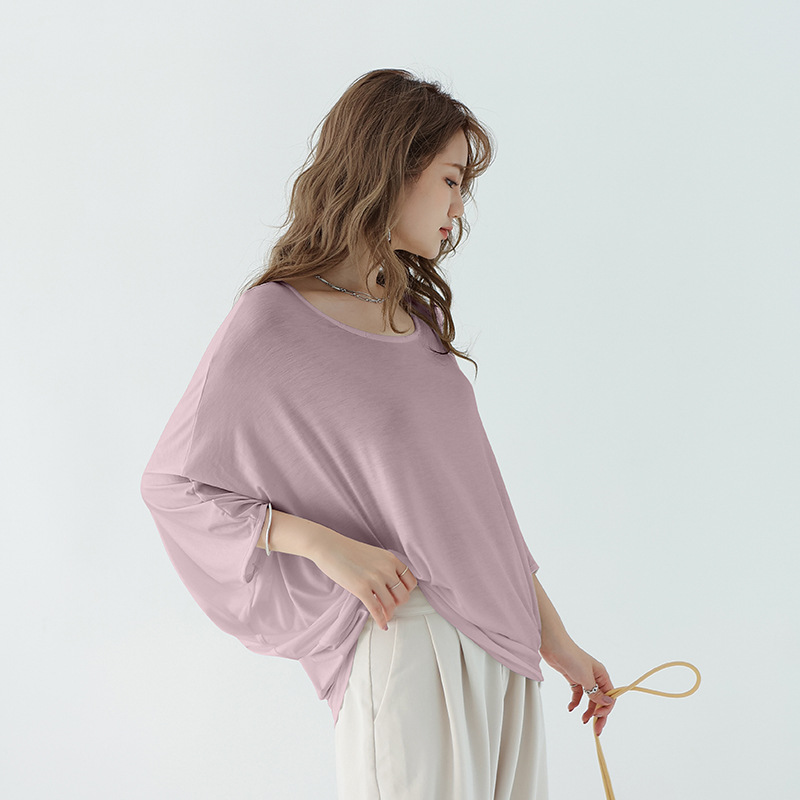 여름 한국 스타일 단색 여성 의류 모달 박쥐 소매 느슨한 반팔 티셔츠 슬리밍 탑 얇은 라운드 넥 플러스 사이즈