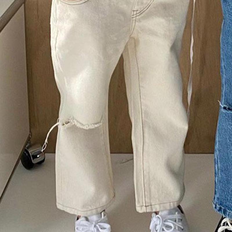 아동 가을 신상 트렌디 팬츠, 남아 여아 한국 스타일 루즈핏 패셔너블 개성있는 워싱 데미지 스트레이트 진스토어 가기