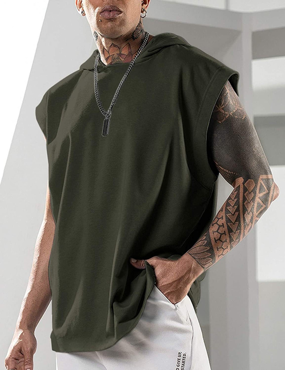 2021 여름 남성 피트니스 트레이닝 풀오버 스포츠 레저 유럽과 미국 패션 슬리브 후드 말 클립 남성용 단색 조끼스토어 가기