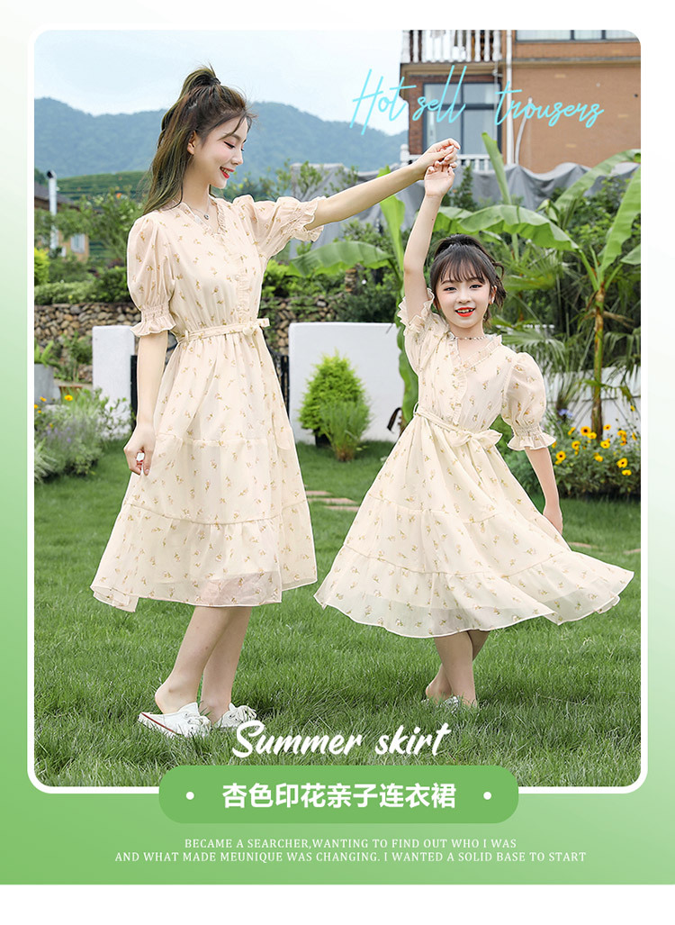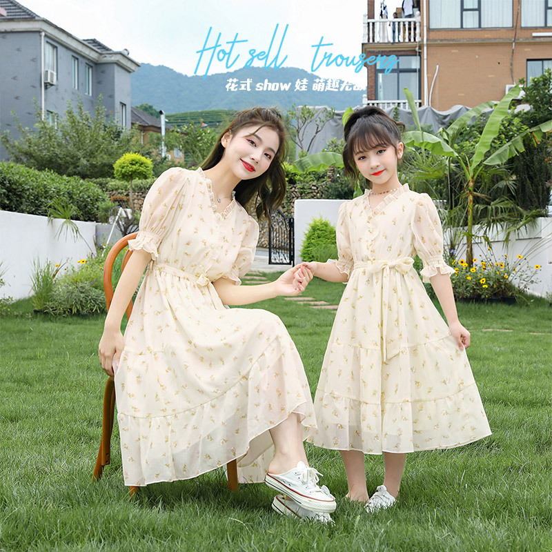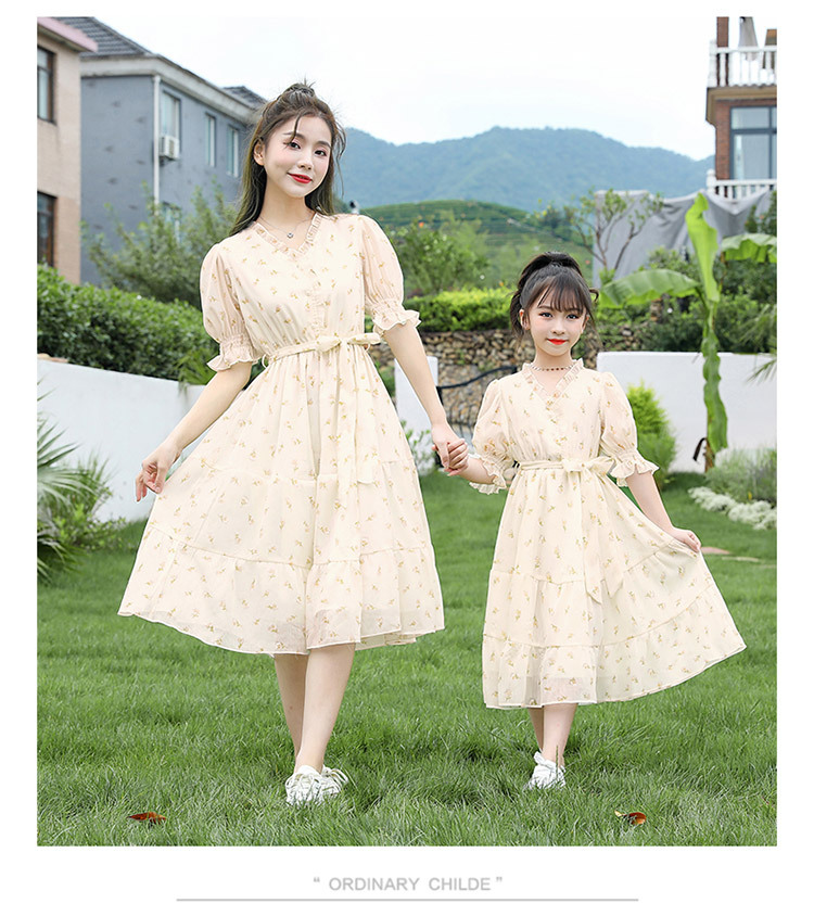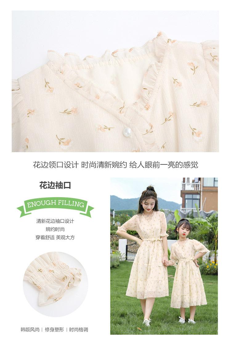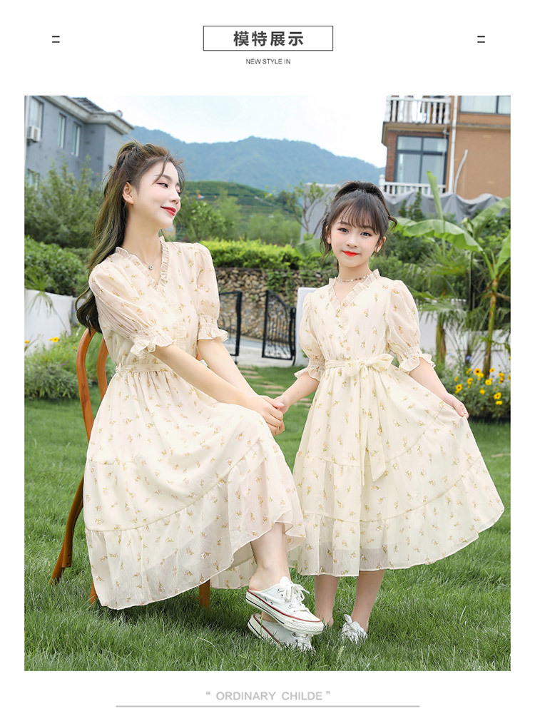 어린이 보헤미안 긴 살구색 꽃 원피스 어머니-딸 부모-자식 세트 어머니 딸 레이스 칼라 쉬폰 얇은 스커트스토어 가기